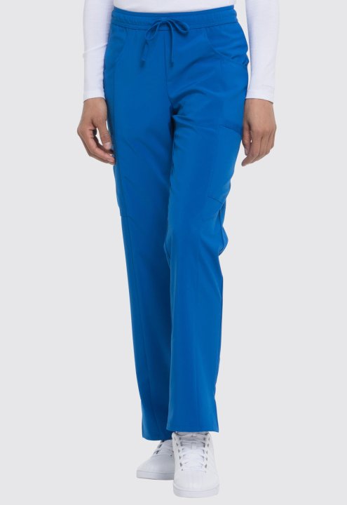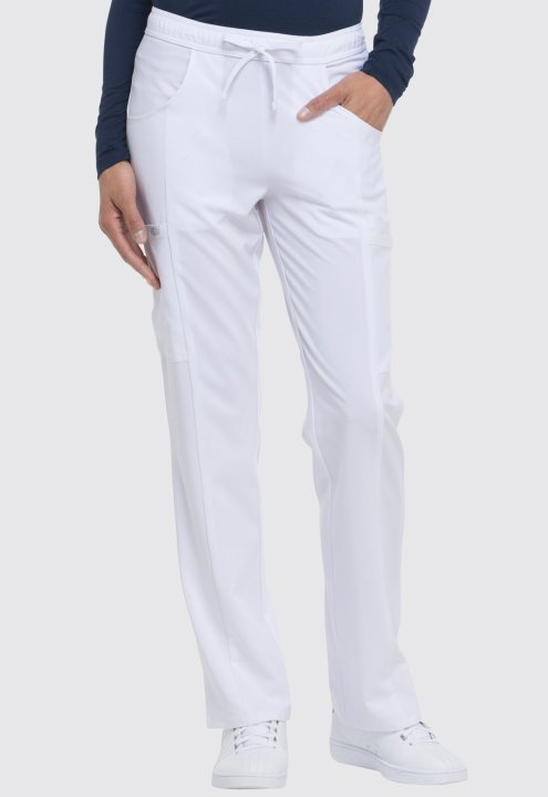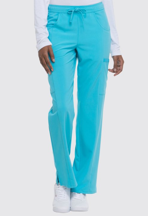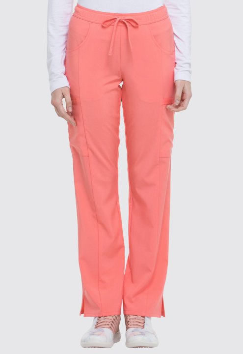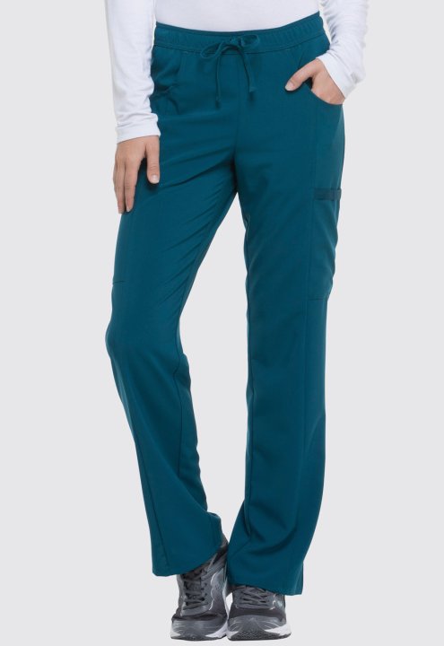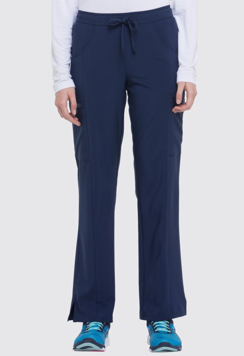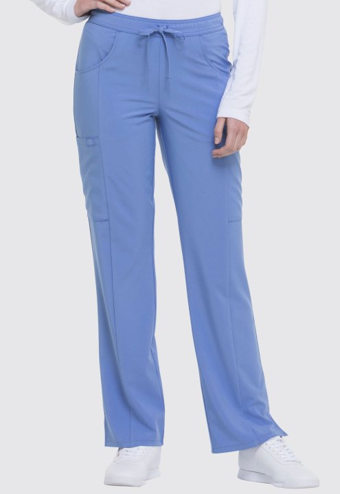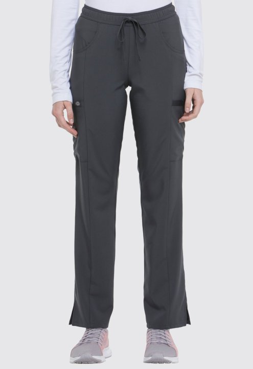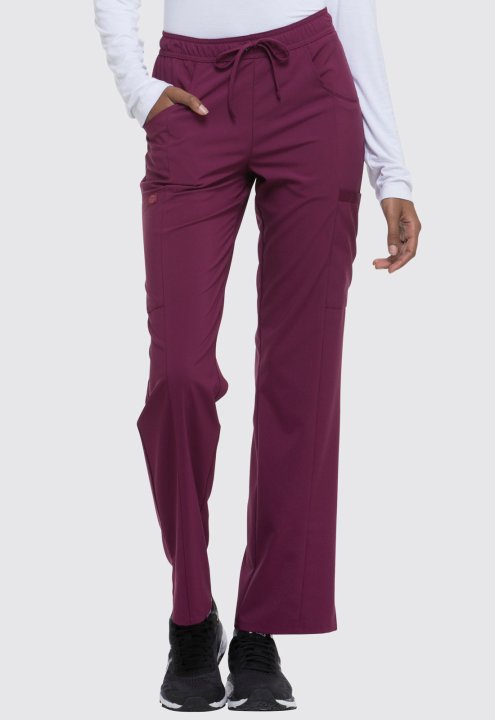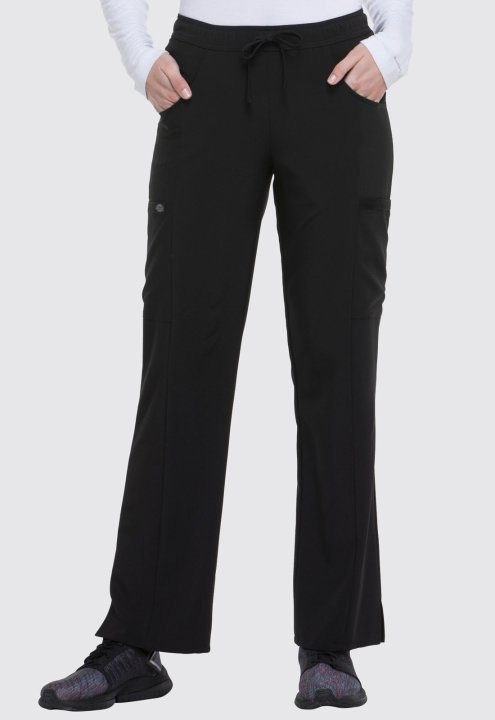 A Contemporary fit, mid rise, straight leg pant features an all around elastic waistband with a functional drawstring and seven pockets. Two front pockets, two cargo pockets, two back pockets, and a scissor pocket. Also featured is a signature tonal woven