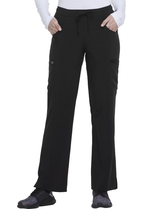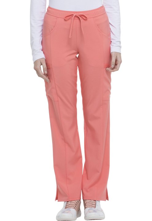 A Contemporary fit, mid rise, straight leg pant features an all around elastic waistband with a functional drawstring and seven pockets. Two front pockets, two cargo pockets, two back pockets, and a scissor pocket. Also featured is a signature tonal woven