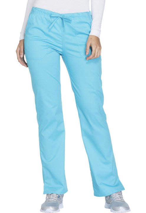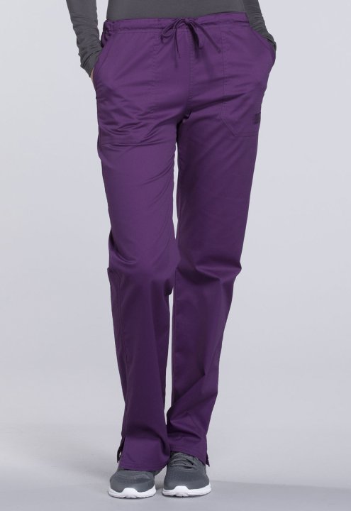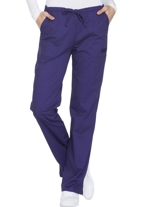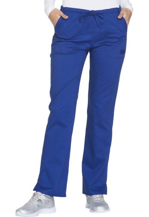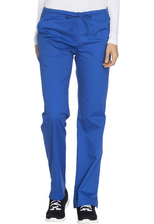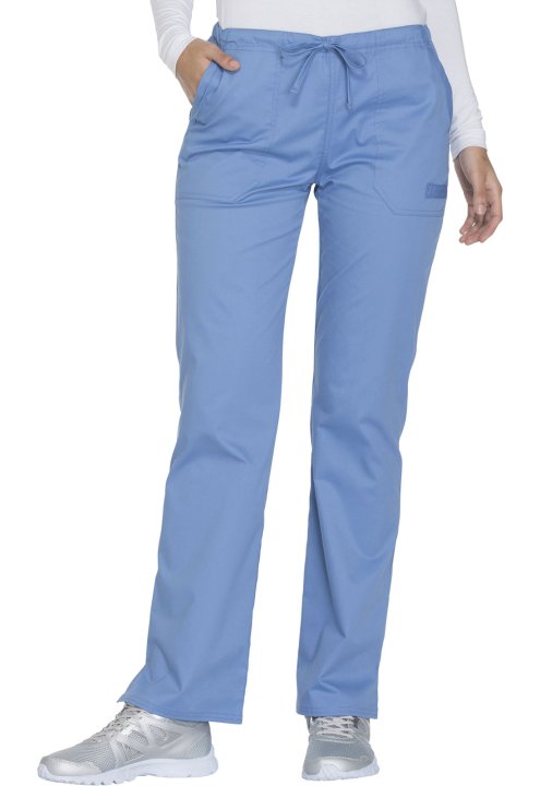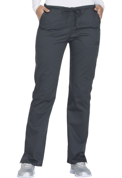 A Modern Classic fit, mid rise, straight leg pant features a functional drawstring and all-around elastic waistband. Also featured are front angled pockets (the right with an interior scissor pocket, the left with an instrument loop), back patch pockets a