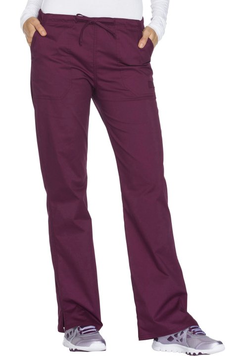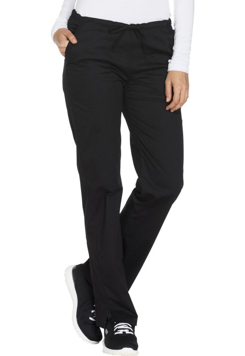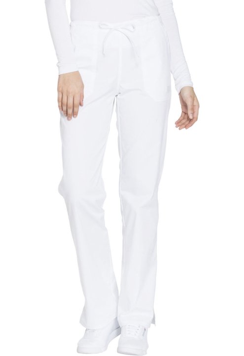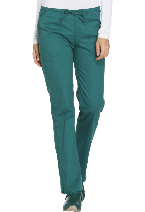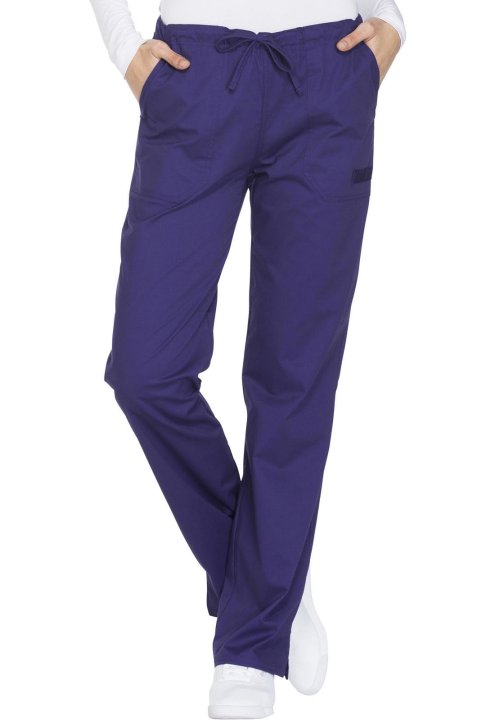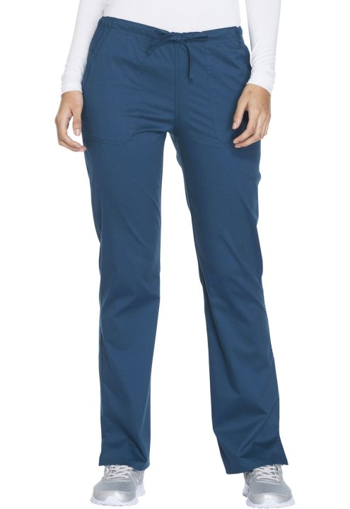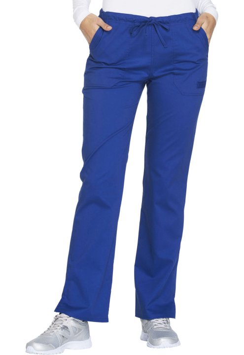 A Modern Classic fit, mid rise, straight leg pant features a functional drawstring and all-around elastic waistband. Also featured are front angled pockets (the right with an interior scissor pocket, the left with an instrument loop), back patch pockets a