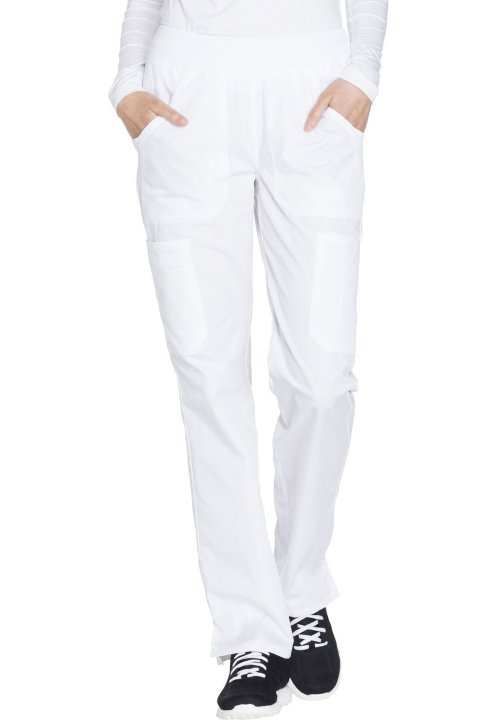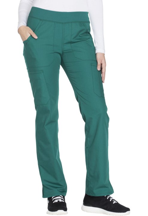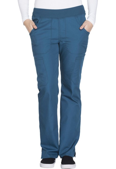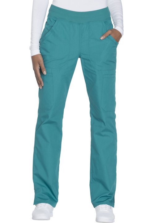 A Contemporary fit, mid rise, straight leg pant features a comfort-fit rib knit waistband reinforced with inside elastic for extra support, and front patch pockets with rib knit insets for expandability without sagging. Also featured are two cargo pockets