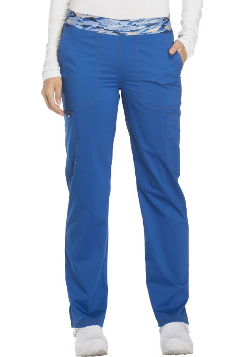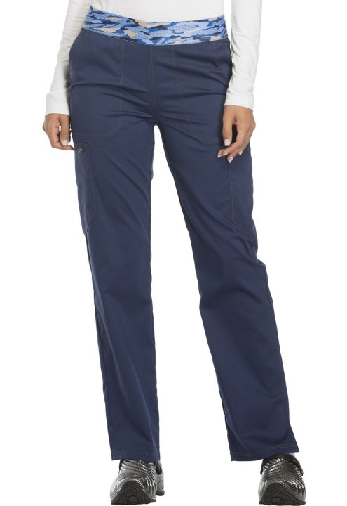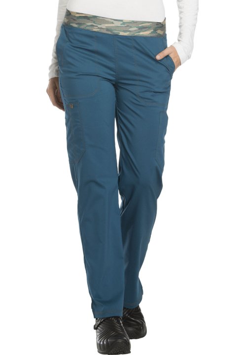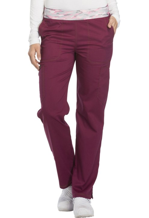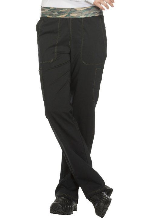 A Contemporary fit, mid-rise, tapered leg, pull-on pant features an all-around elastic waistband, front slash pockets and cargo pockets (the right with a pen slot, the left with an inside Dickies logo twill-tape instrument loop). Also featured are , and d
