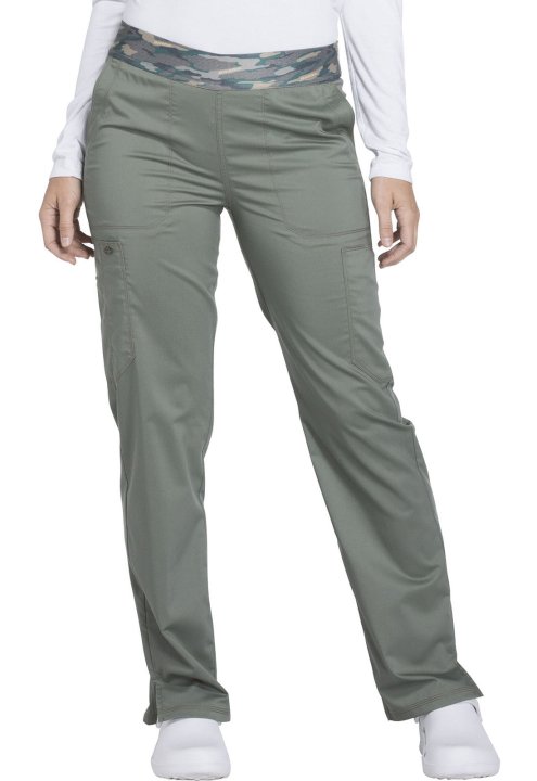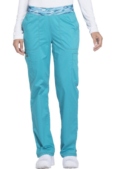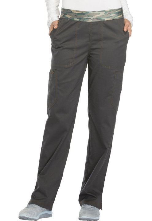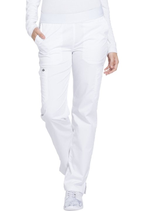 A Contemporary fit, mid-rise, tapered leg, pull-on pant features an all-around elastic waistband, front slash pockets and cargo pockets (the right with a pen slot, the left with an inside Dickies logo twill-tape instrument loop). Also featured are , and d