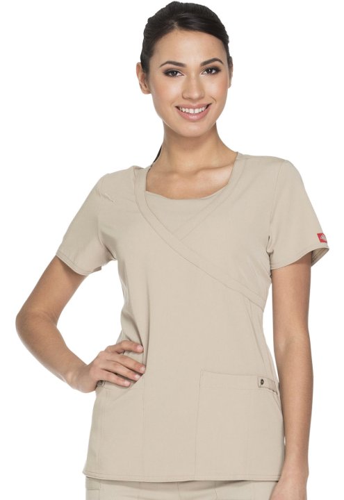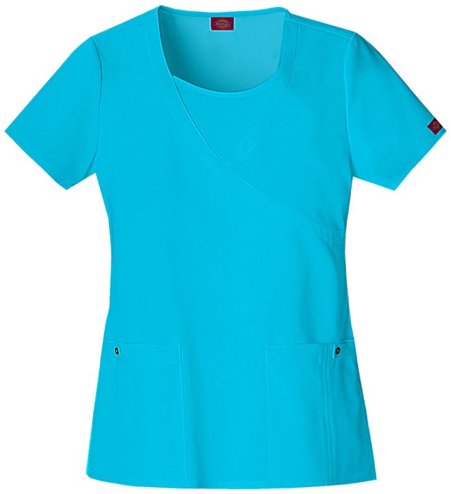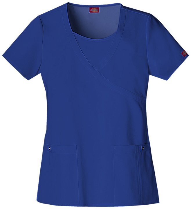 A Contemporary fit mock wrap top features afront inset for modesty. The patch pockets feature stitch detailing and functional tabs with Dickies logo eyelet trim. Also featured are double needle stitching, back darts and side vents for a roomy fit. Center