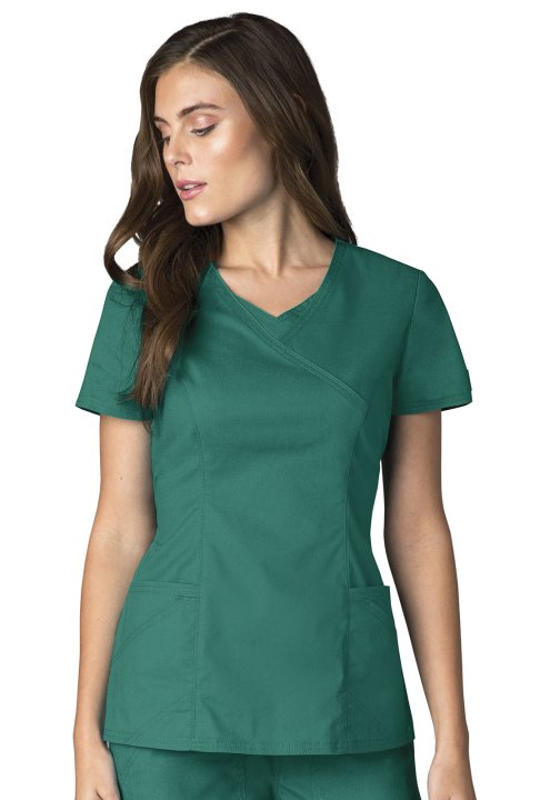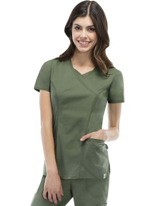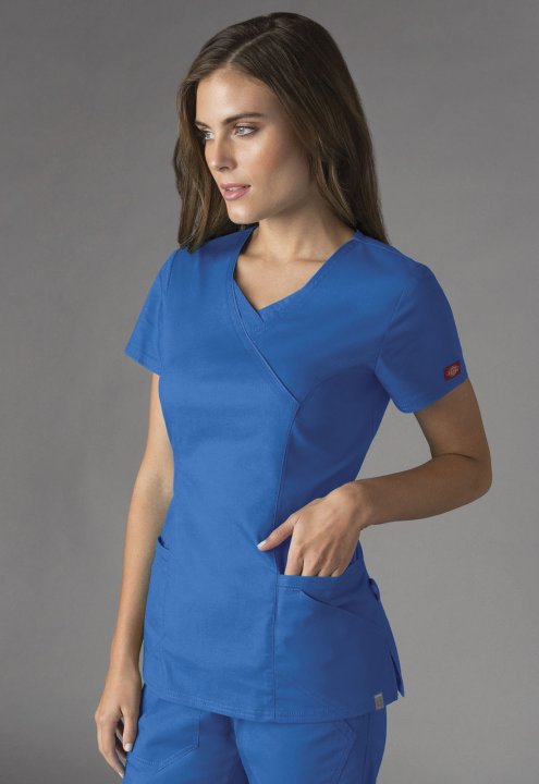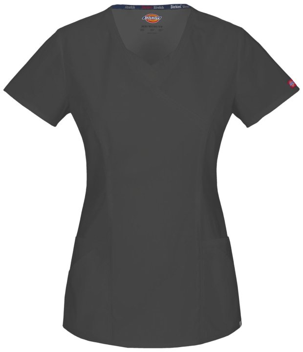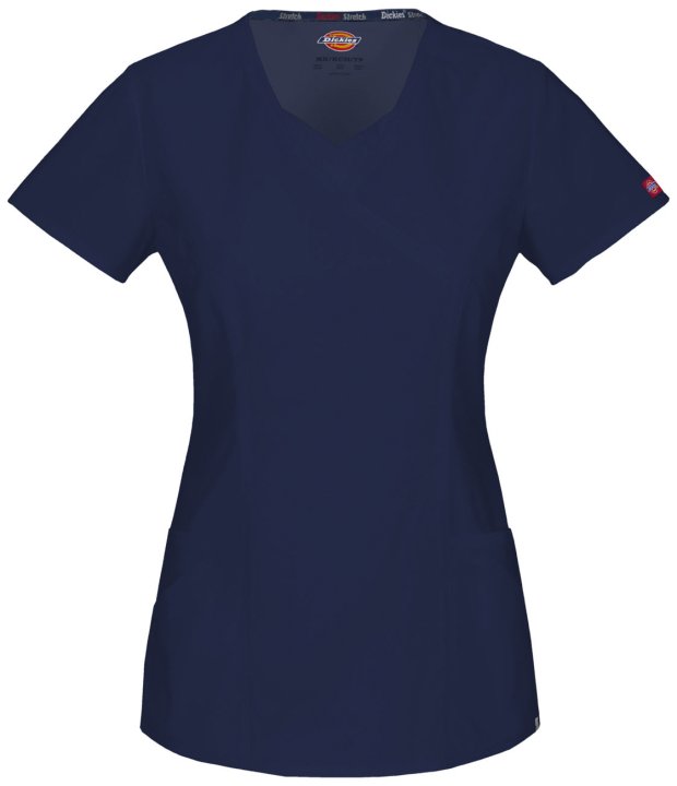 A Contemporary fit mock wrap top with a crossover inset features Dickies logo twill tape at the back neck and as an instrument loop inside the left patch pocket. Also featured are four front pockets, an exterior loop and stylized seams. Back darts and sid