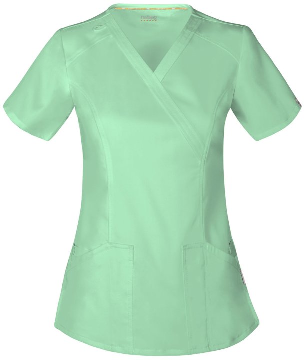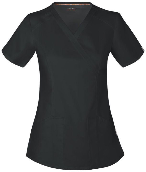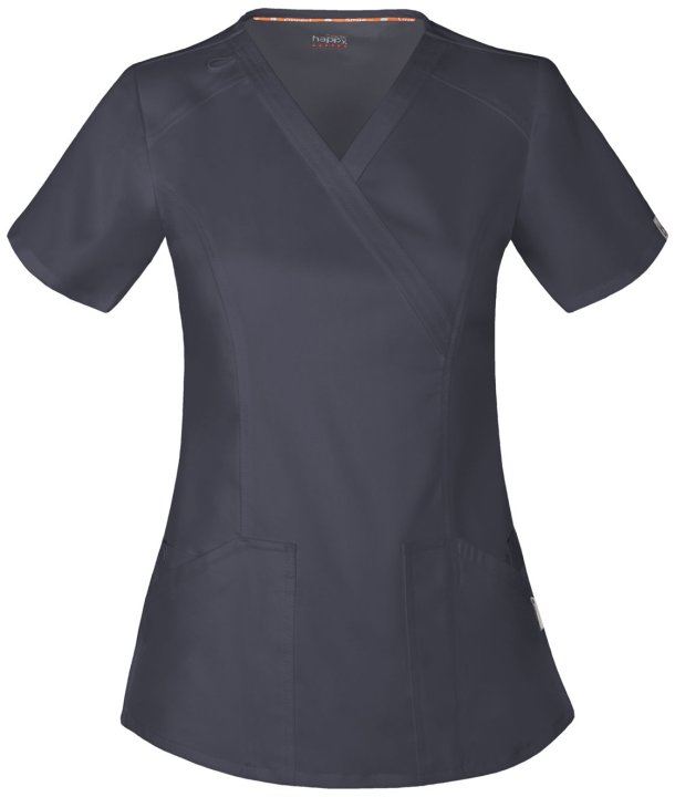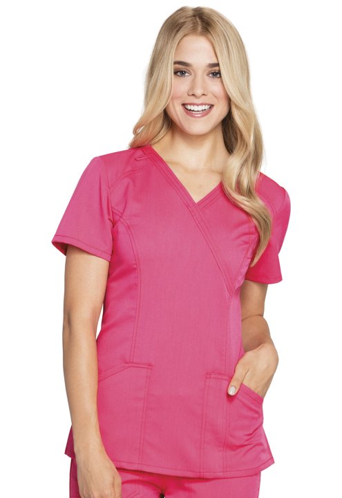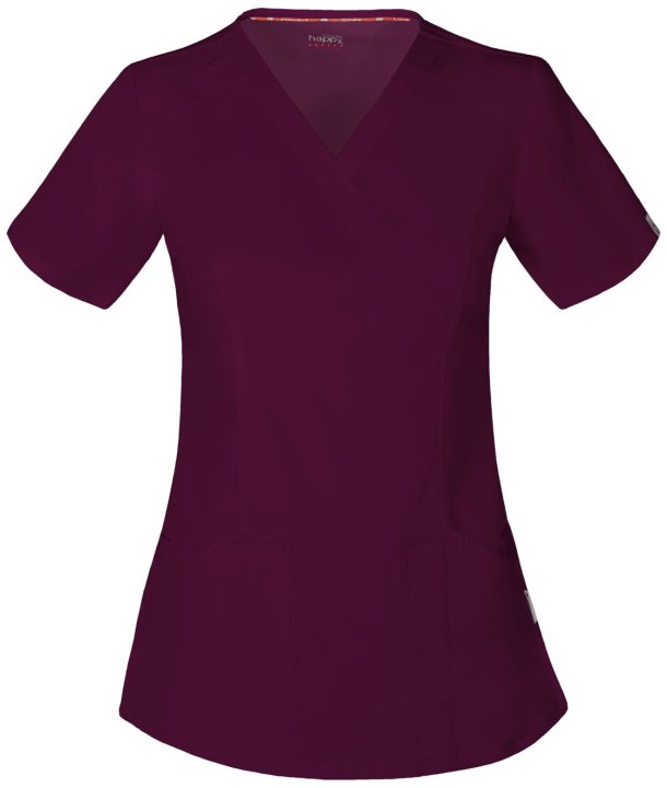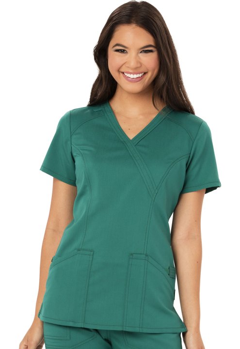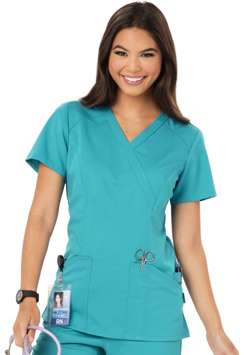 This Contemporary fit mock wrap top contours your curves for an exceptionally flattering fit. Multi functional pockets hold all your gear and inside snap closure pocket reveals a hidden message: smileloveconnect. Added features include an instrument loop