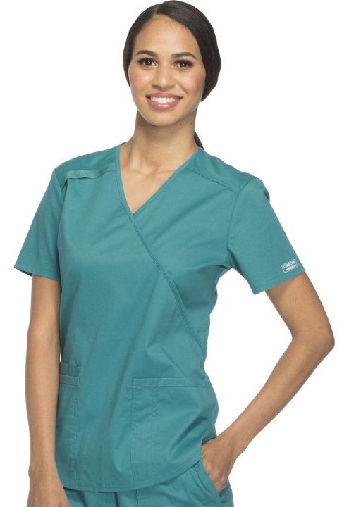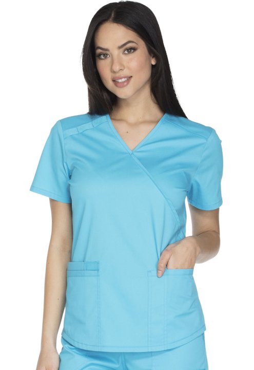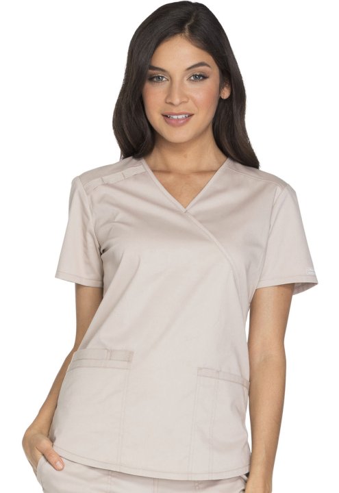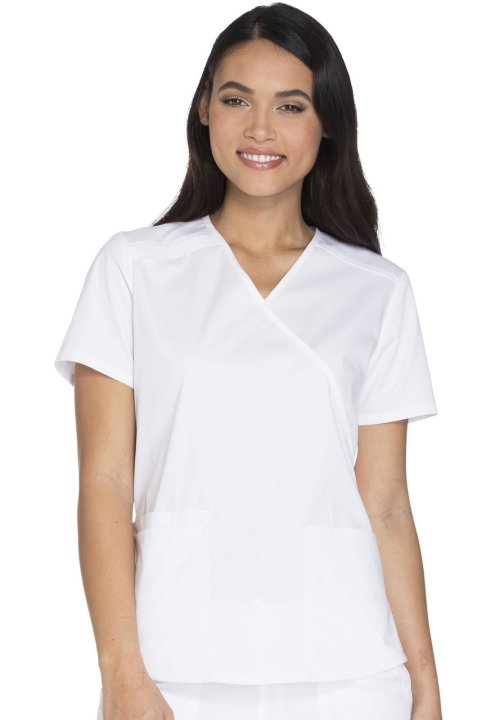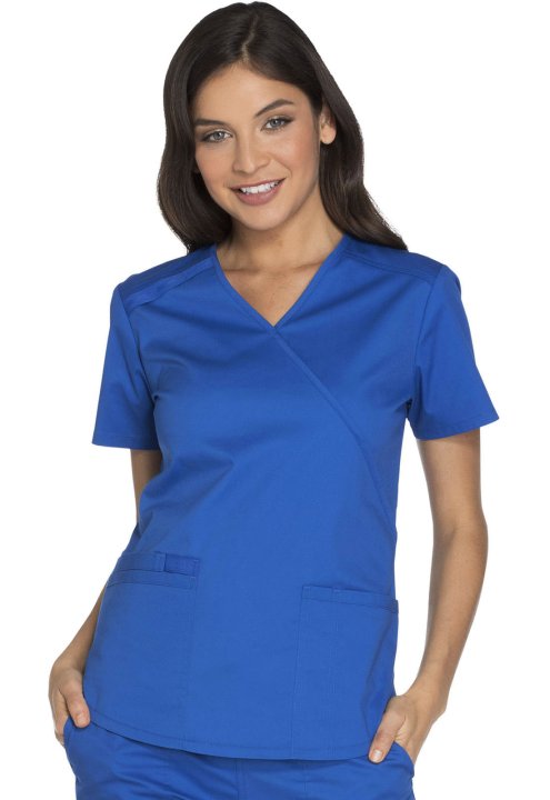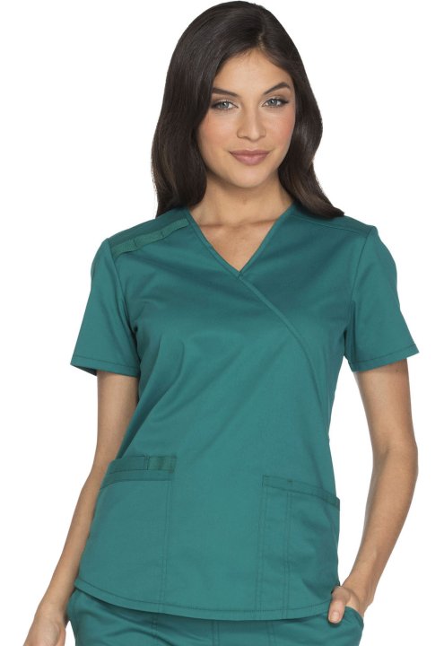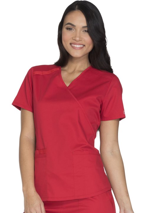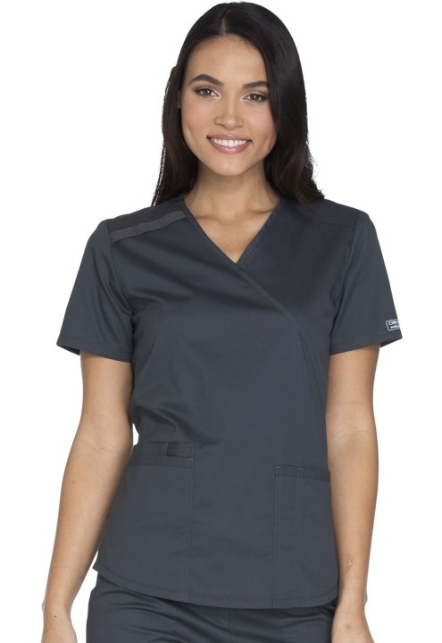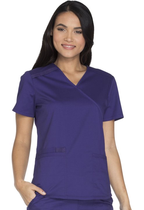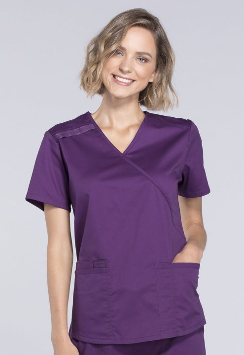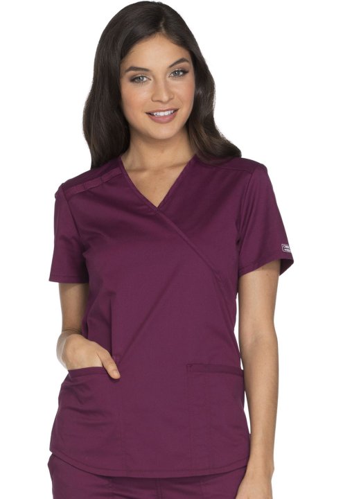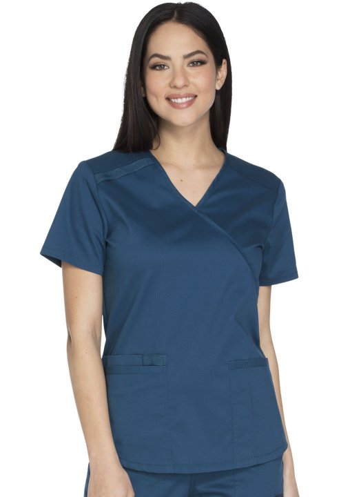 A Modern Classic fit mock wrap top features a pen/instrument loop on the right shoulder yoke, two patch pockets (the right with an interior pocket and additional loop detail, the left with a pen slot), back yoke and side vents. Center back length: 27