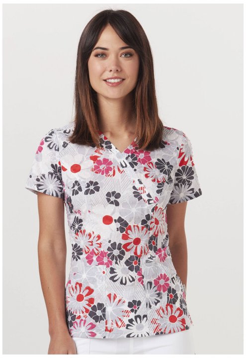 A Contemporary fit mock wrap top is contoured to your curves for an exceptionally flattering fit. Multifunction pockets hold all your gear, while an additional snap-closure pocket revels the message, smile, love, connect. Also featured is an instrument lo