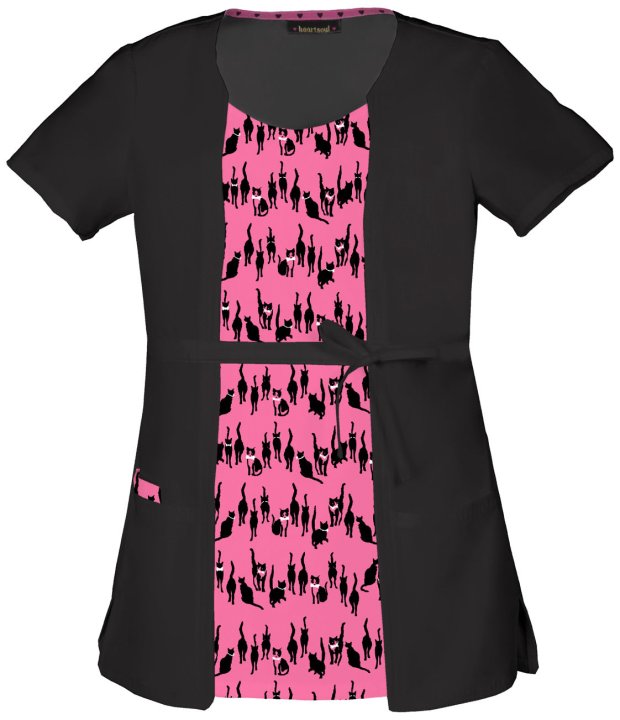 A round neck top features a printed front panel creating a 2-fer effect, a front adjustable drawstring, back elastic, and patch pockets with a small interior pocket. Also featured are double needle topstitching, a signature woven tape at back the neck, an