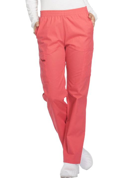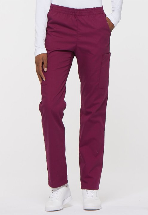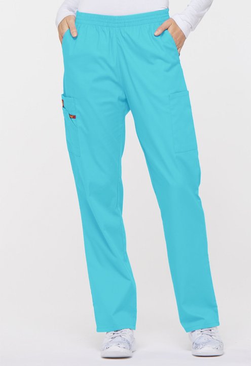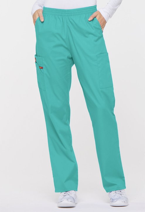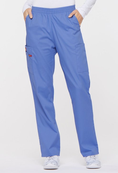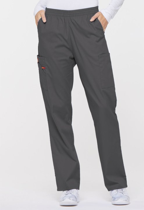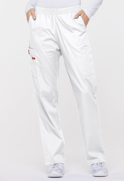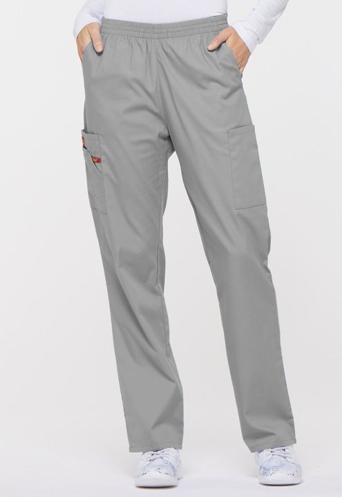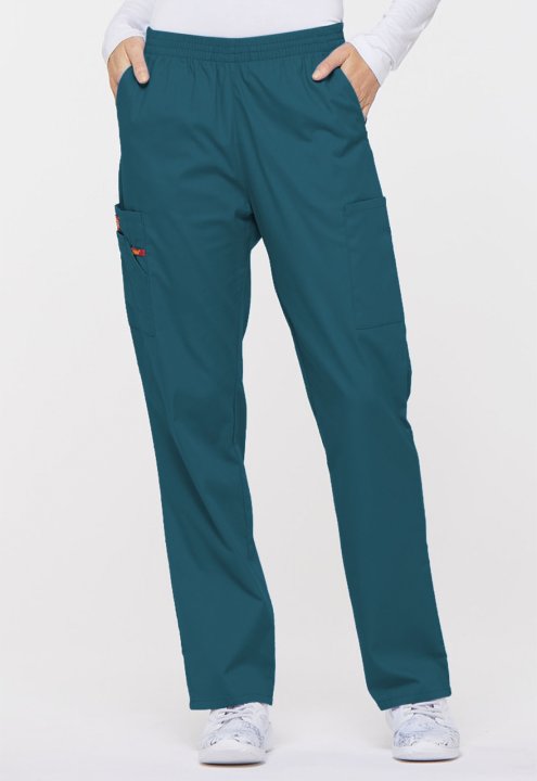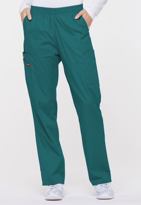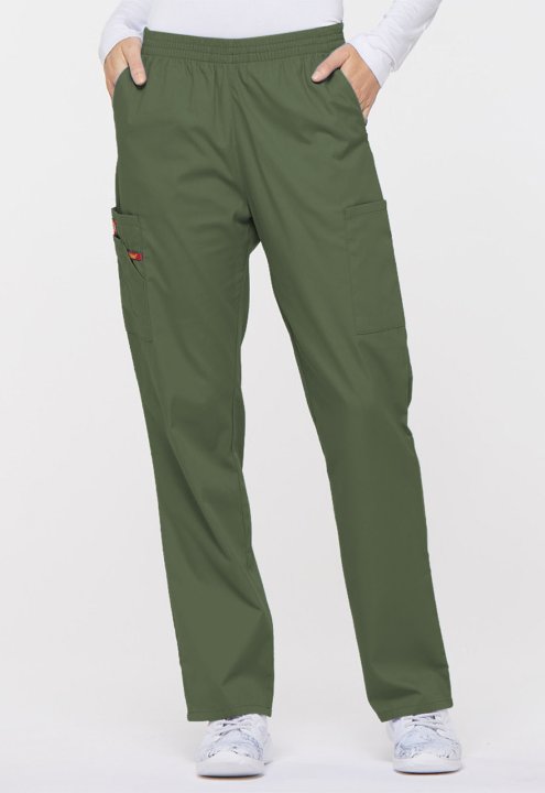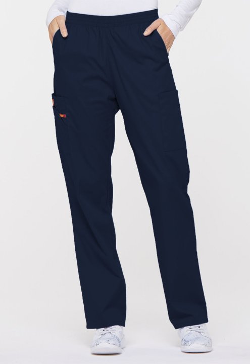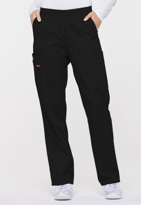 A Modern Classic fit, natural rise, tapered leg, pull-on pant features an all around elastic waistband with a Dickies logo twill tape on the inside back waistband and has an instrument loop on the right cargo pocket. Also featured are slash pockets and ca