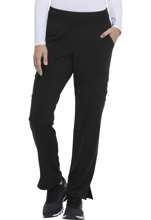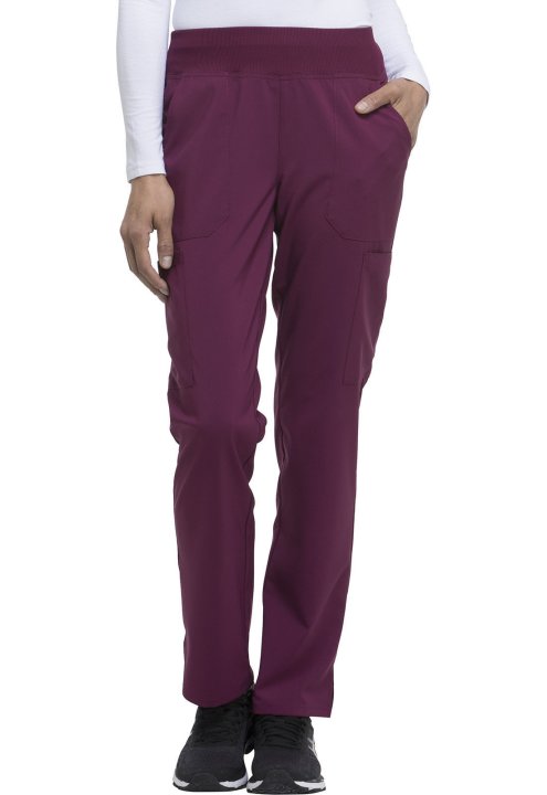 A Contemporary fit, natural rise, tapered leg pant features an elastic rib knit waistband with seven pockets. Two front pockets, two cargo pockets, two back pockets, and a scissor pocket. Also featured is a signature tonal woven label, a utility twill ta