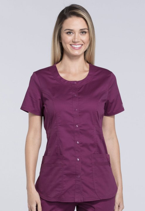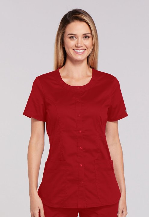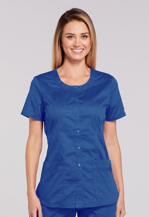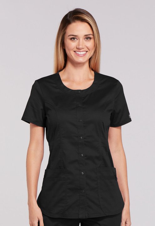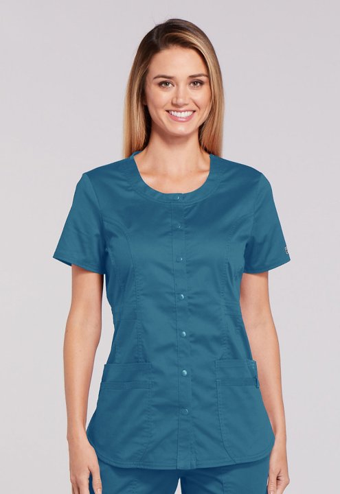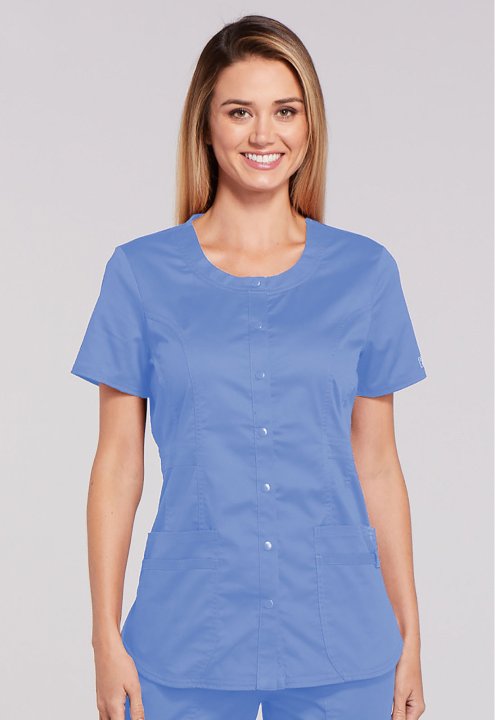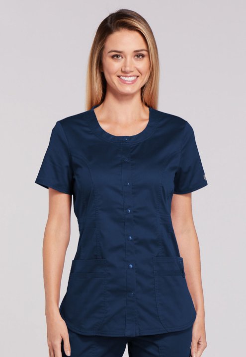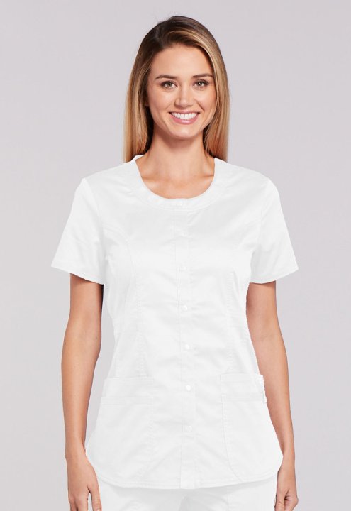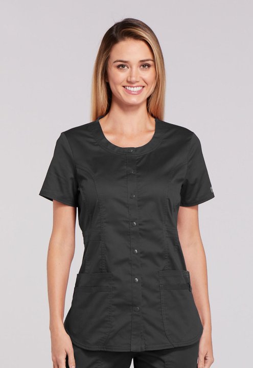 A Modern Classic fit snap front top features a round neck, three patch pockets, a cell phone pocket with instrument loop, flattering belt detail at the waist, front and back princess seams, a shirttail hem and side vents for ease of movement. Center back