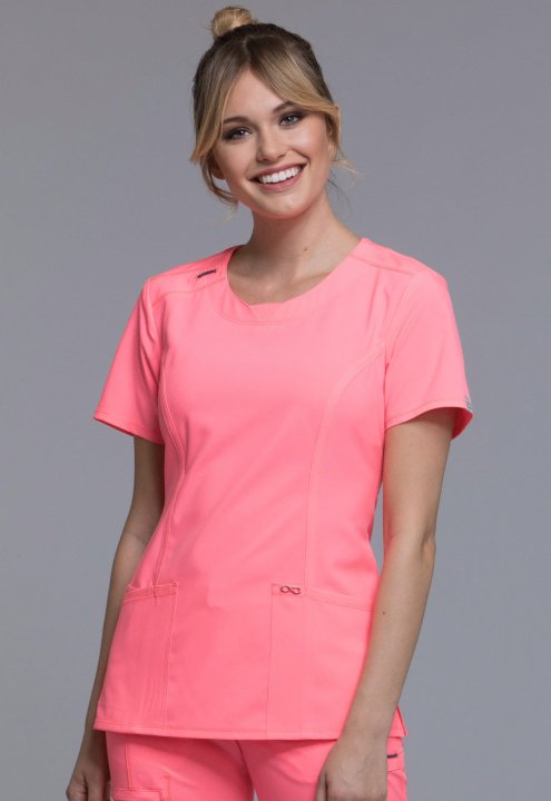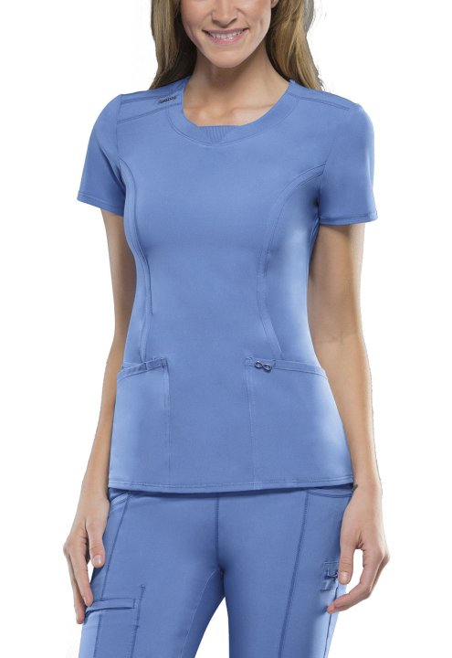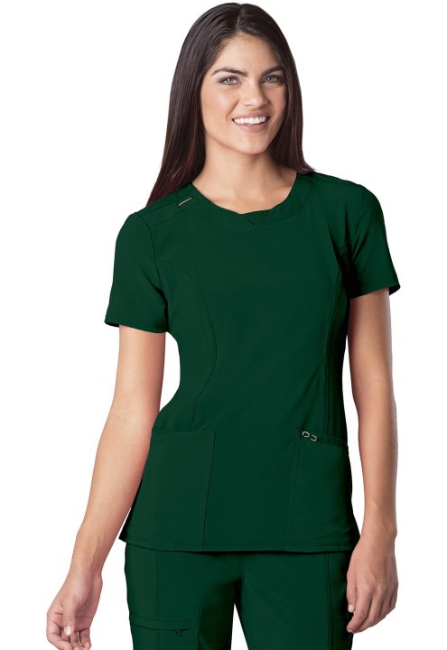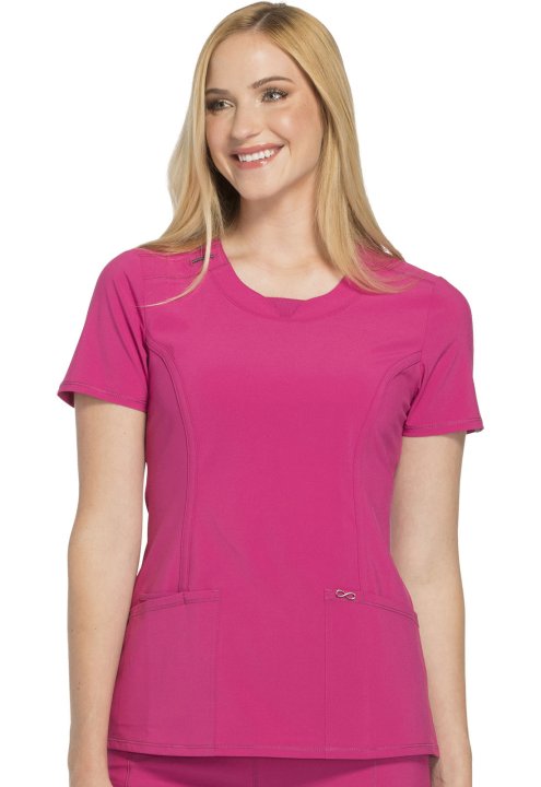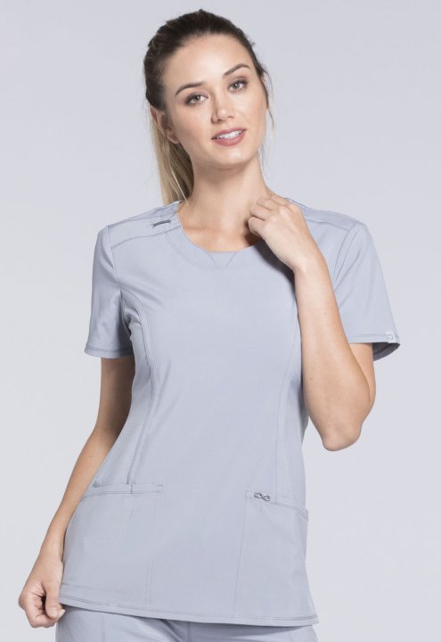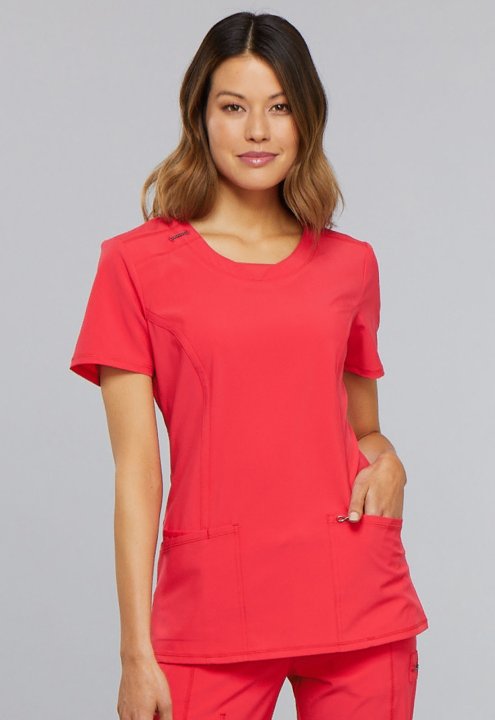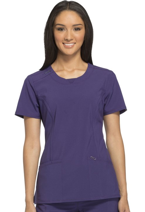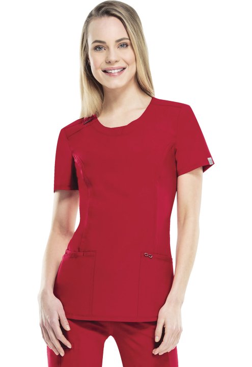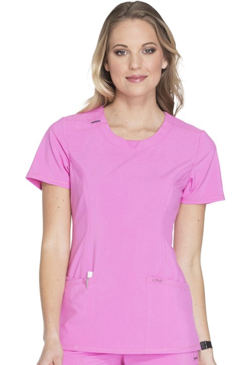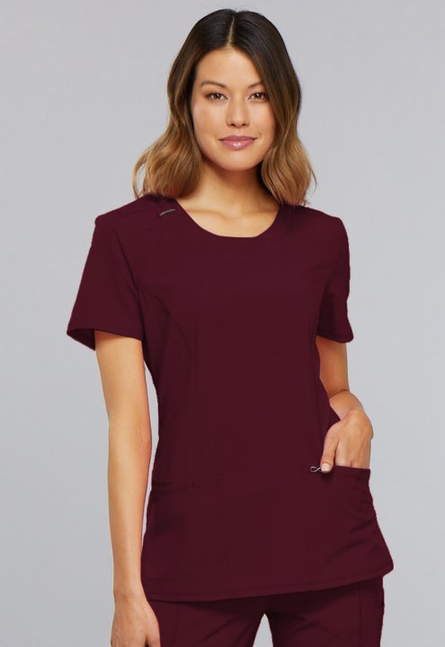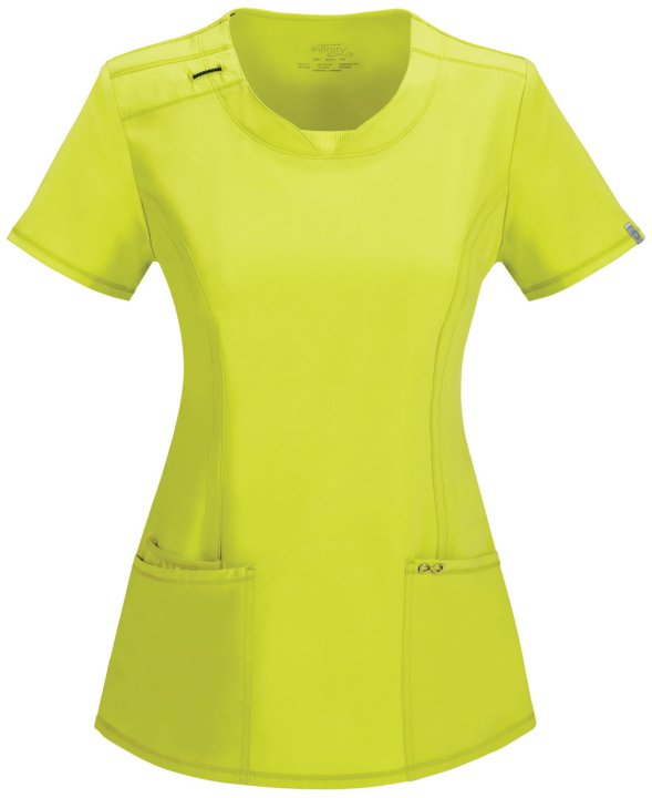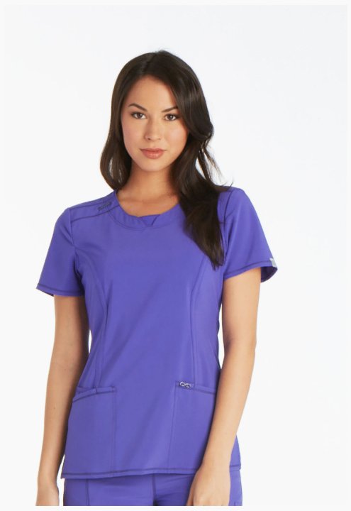 A Contemporary fit round neck top with a rib knit inset at the front neckband also featured are shoulder yokes, a bungee I.D. badge loop on the right shoulder, front and back princess seams, two patch pockets, one interior pocket, and side vents. Stretch