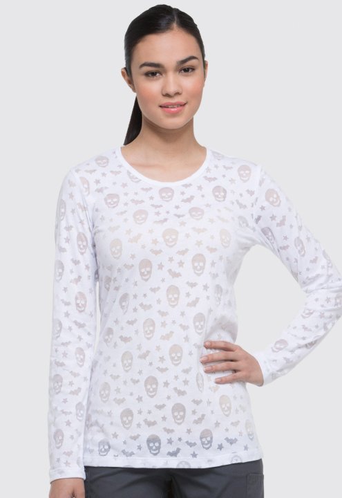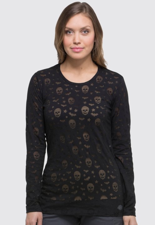 A long sleeve crew neck underscrub knit tee with double needle topstitching. Center back length: 27".