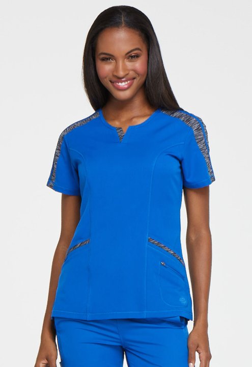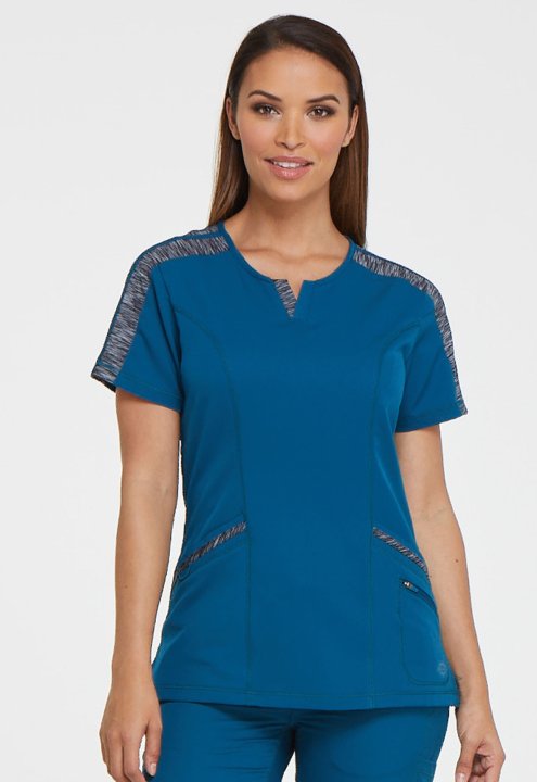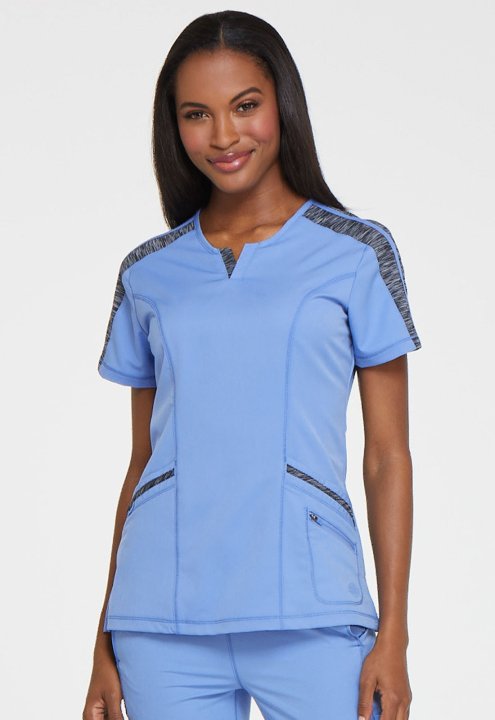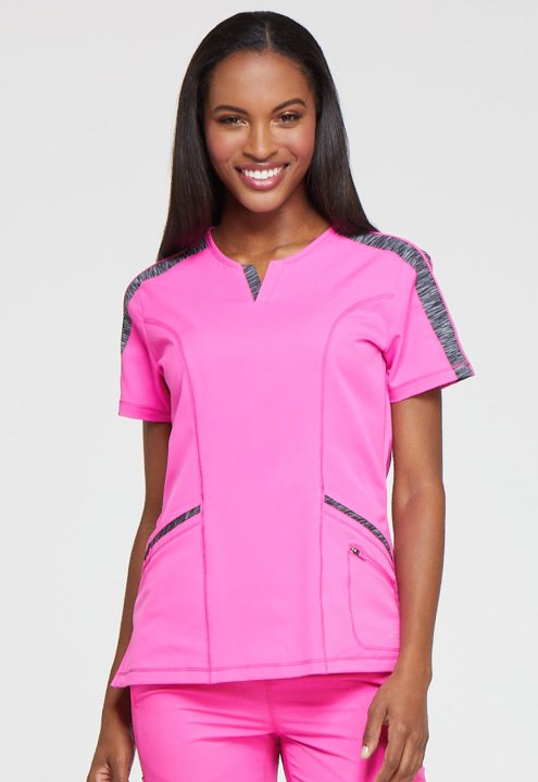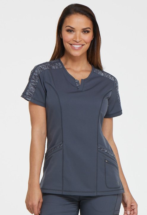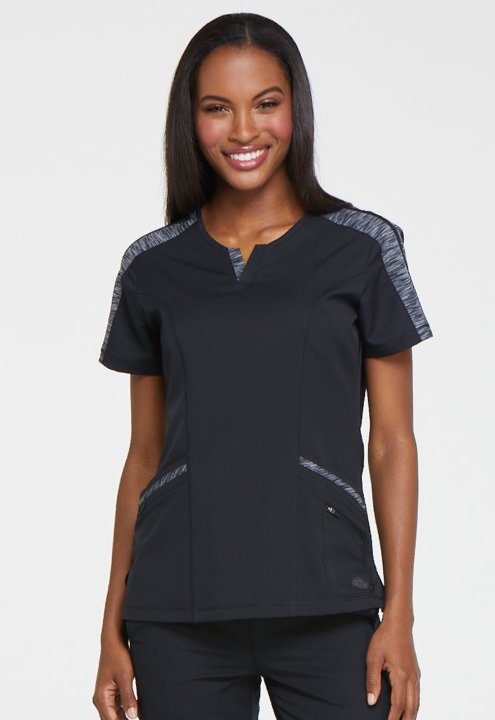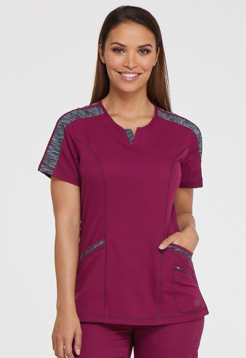 This polished splitneck top features space-dyed knit accents at the shoulder, neck, and pocket strapping, and coverstitch detail throughout. Additional design details include two front patch pockets with a dyed-to-match bungee and an inside tonal cable-ro