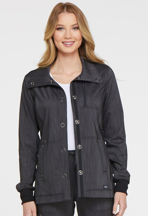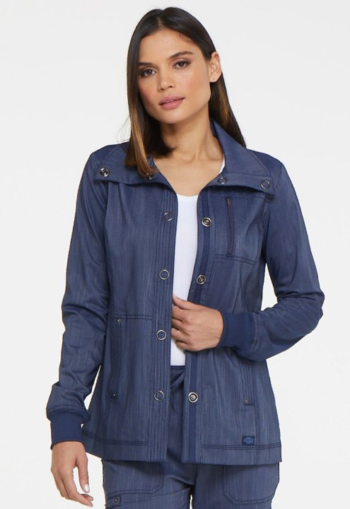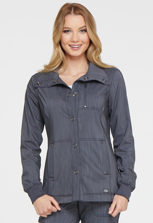 Our snap front jacket features front and back princess seaming for a flattering slim fit, two inseam front pockets,one zipper chest pocket and rib knit cuffs. Additional design details include decorative topstitching, Dickies logo rivets, and a Dickies to