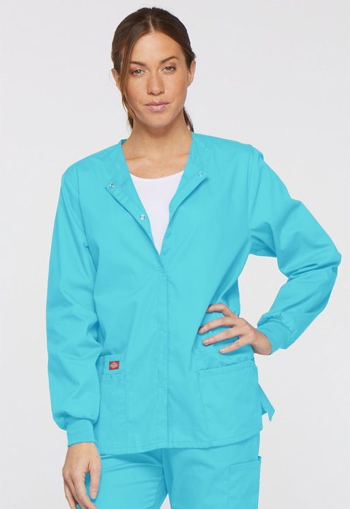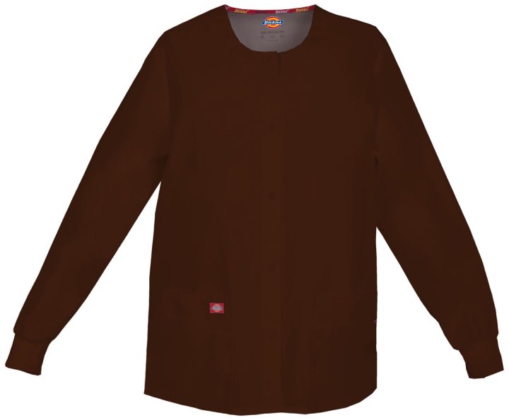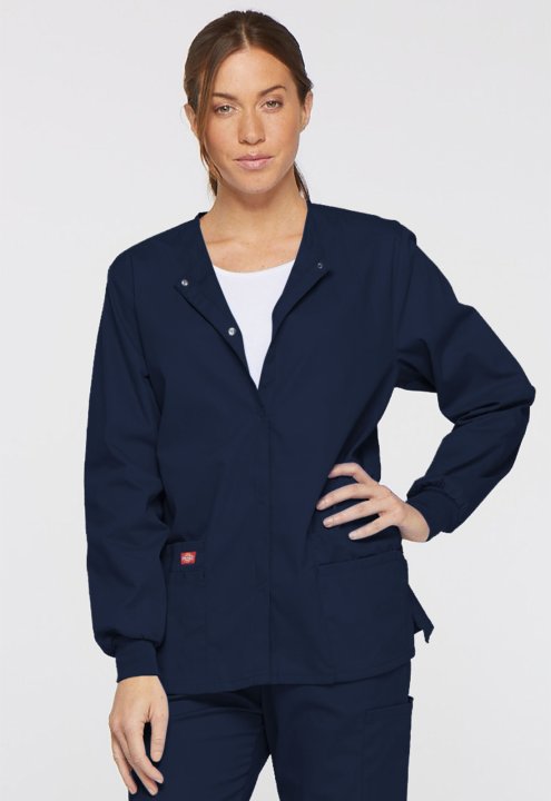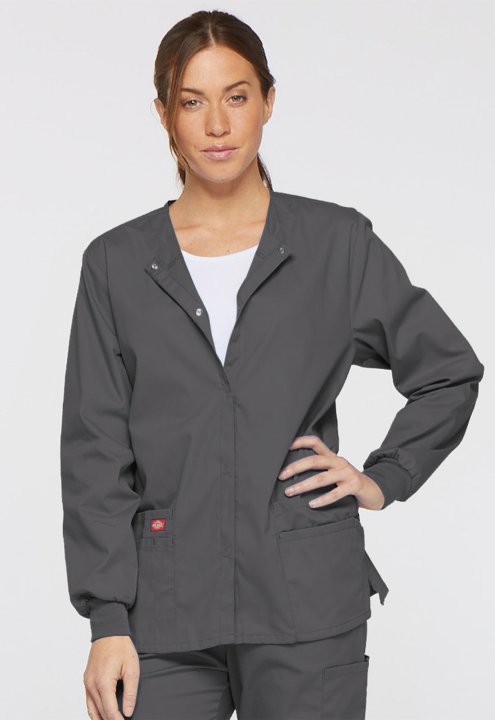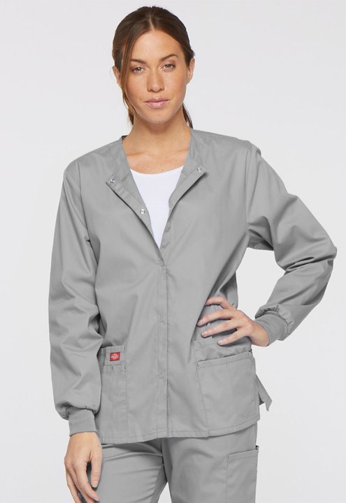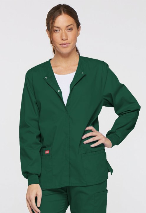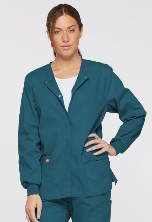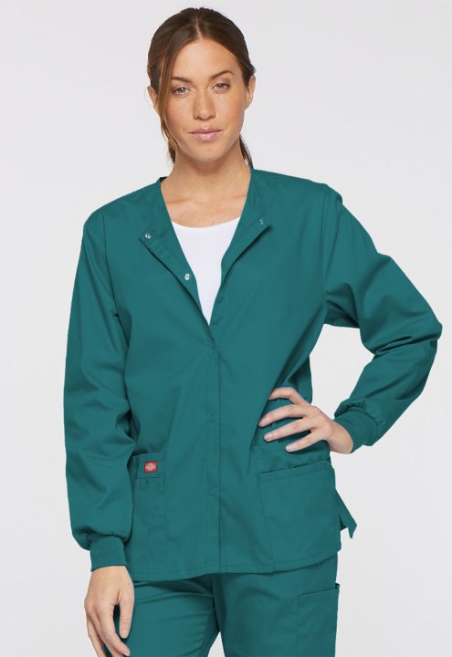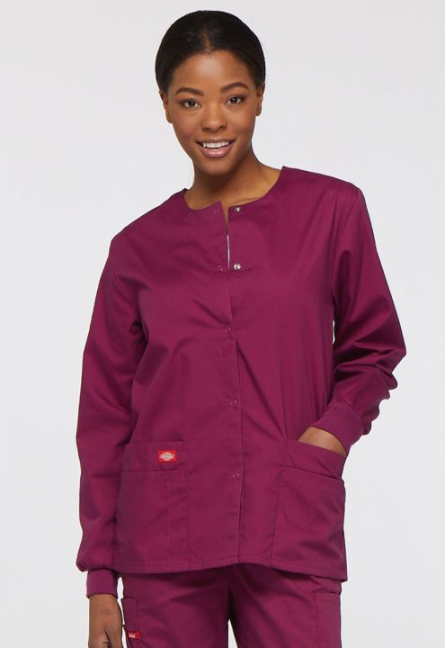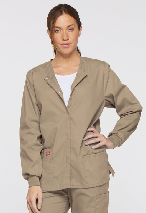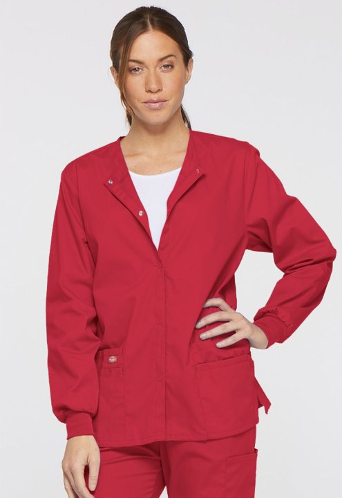 A Modern Classic fit round neck, snap front, warm-up jacket features Dickies logo twill tape at the back neck and an instrument loop on the left pocket. Also featured are knit cuffs, multiple patch pockets, a stretch Red knit interior pocket (White knit p