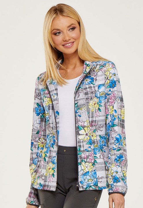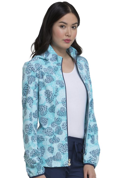 A Contemporary fit, zip front, warm up jacket has a detachable hood, front and back princess seams, patch pockets, and an outer welt pocket with signature Pink contrast bar tacks. Also featured is a hidden functional Pink grommet and bungee loop for headp