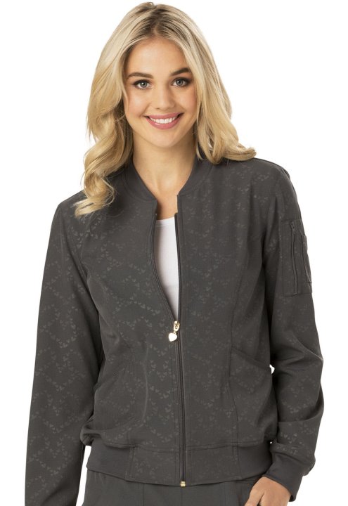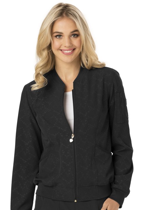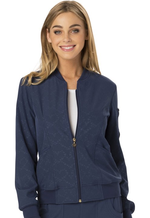 A Contemporary fit, zip front bomber jacket has a rib-knit neckband, waistband and cuffs; two patch pockets; and an outer sleeve pocket with zip closure and utility slots. Also featured are front princess seams and signature woven tape along the back neck