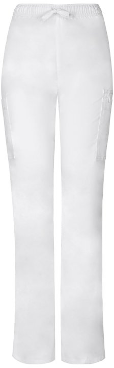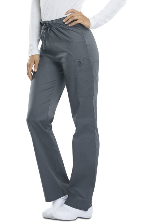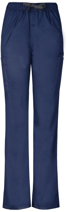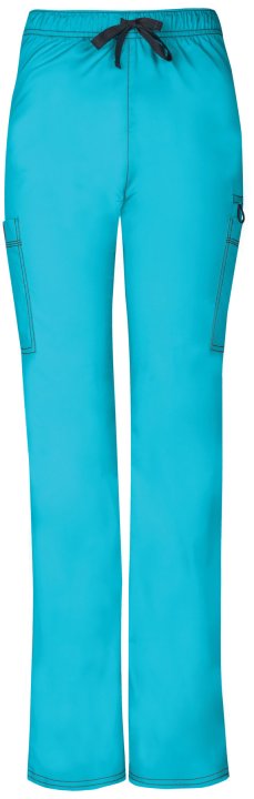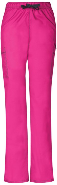 A natural rise, straight leg pull-on pant features an adjustable drawstring with an all around elastic waistband. Also featured are two cargo pockets, instrument loops, a bungee loop, a back pocket with a hook and loop fastener and contrast multi-needle t