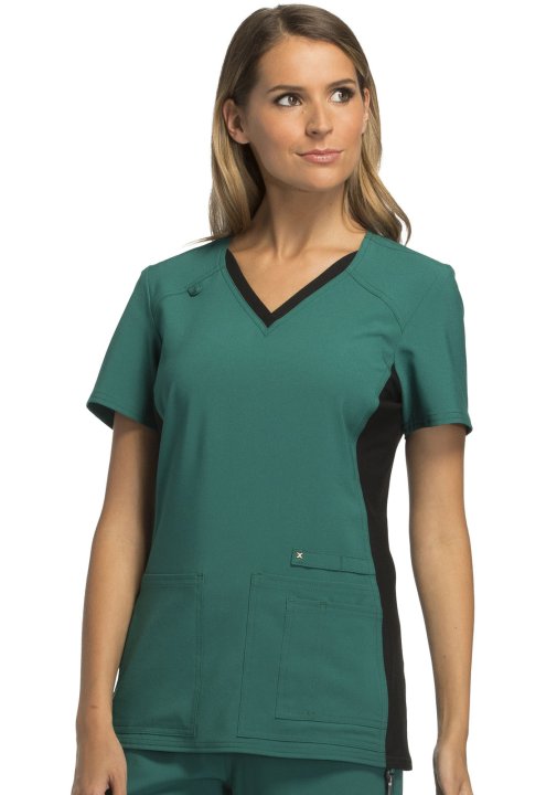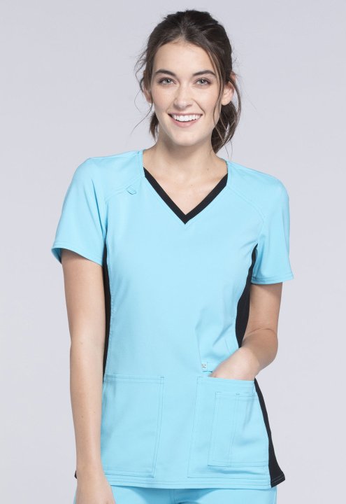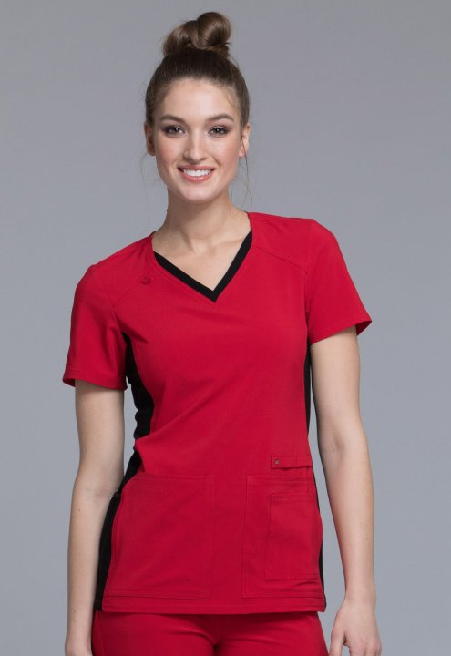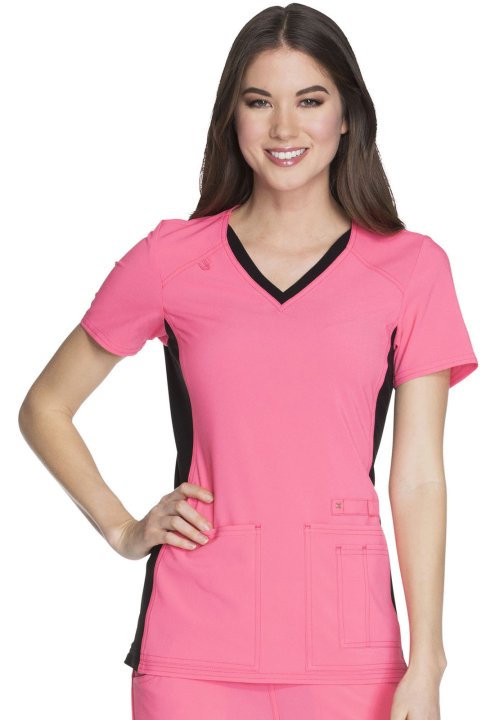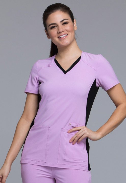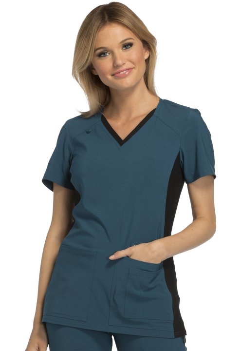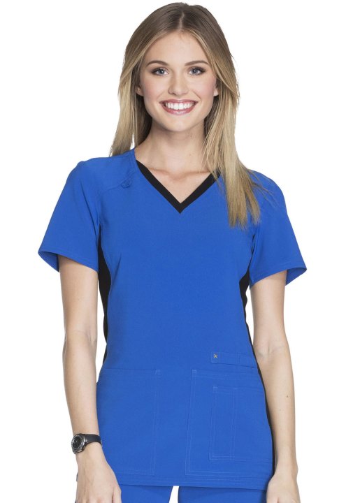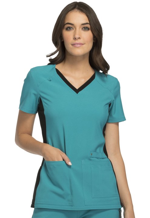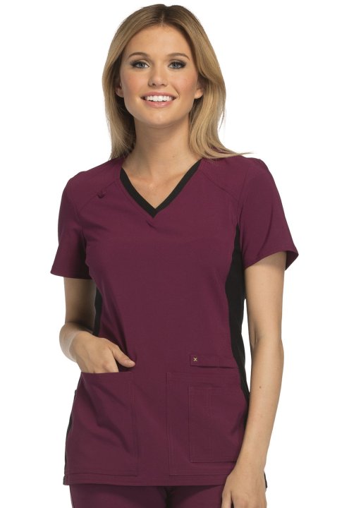 A Contemporary fit V-neck top features two front patch pockets, a scissor pocket, right hip pocket, and instrument loop. Also featured are an I.D. badge loop and back yoke with locker loop. Front and back side panels are in a soft, stretchy knit for extra