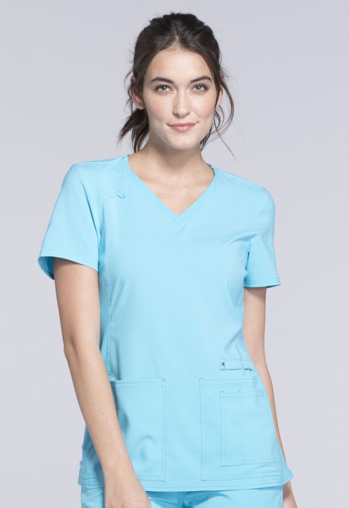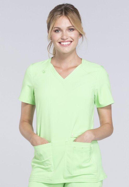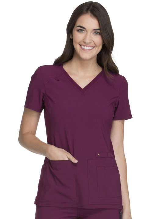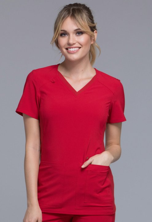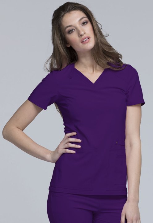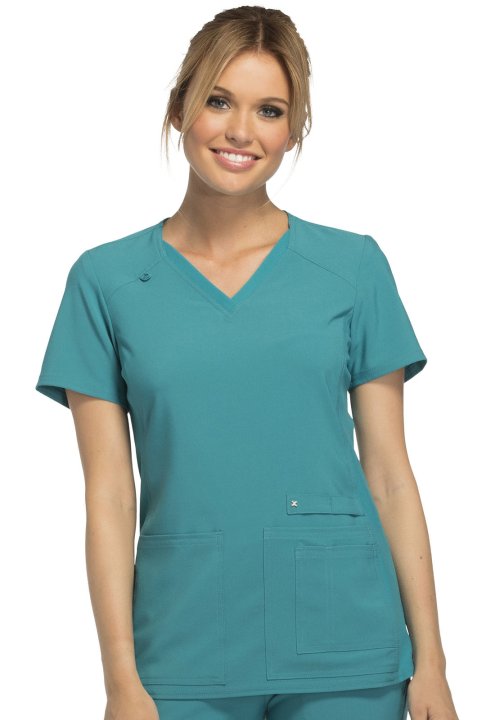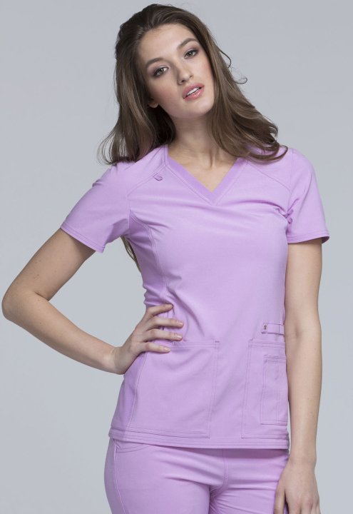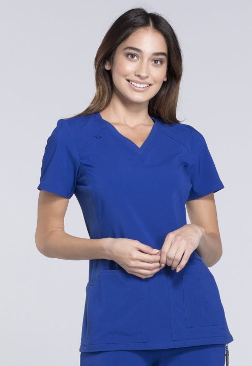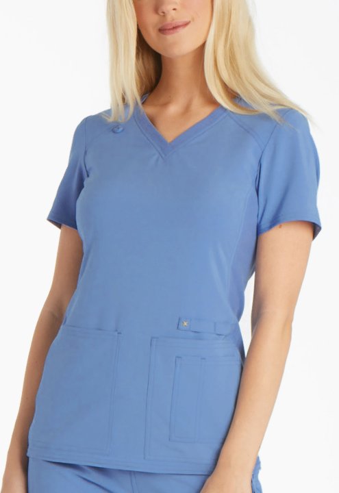 A Contemporary fit V-neck top features two front patch pockets, a scissor pocket, right hip pocket, and instrument loop. Also featured are an I.D. badge loop and back yoke with locker loop. Front and back side panels are in a soft, stretchy knit for extra