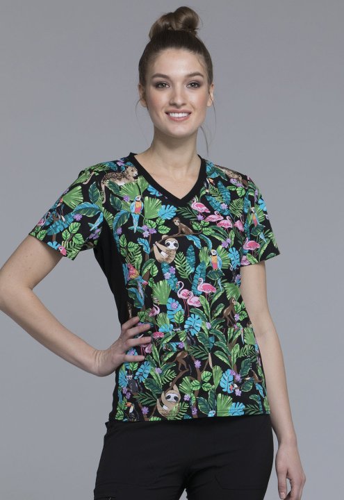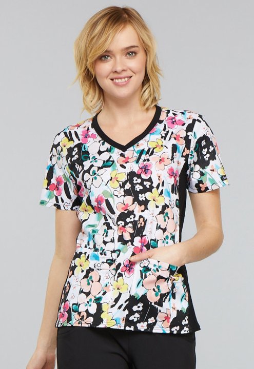A Modern Classic fit V-neck top features two patch pockets, a cell phone pocket, a scissor pocket and an instrument loop. Also featured are knit side panels and knit neckband Center back length: 26"