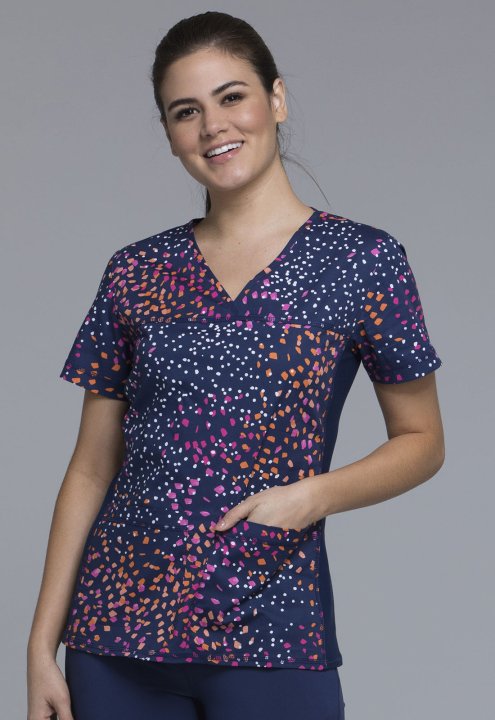 A sporty, Modern Classic fit V-neck features two patch pockets, front and back yokes, contrast stretchy knit side panels for comfort and a slimming look, and coverstitch detail throughout. Center back length:26