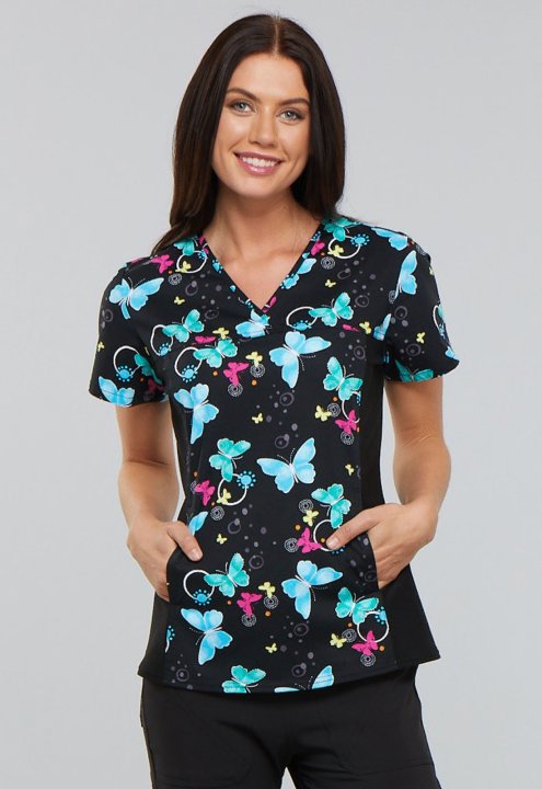 An innovative, Modern Classic fit V-neck top shapes and slims, with soft and stretchy contrast knit side panels. Also featured are two hidden pockets, and front and back yokes. Center back length:25