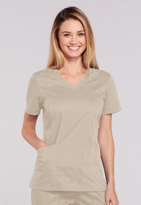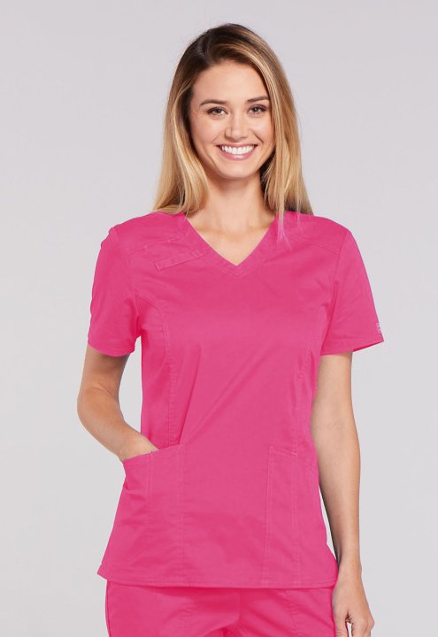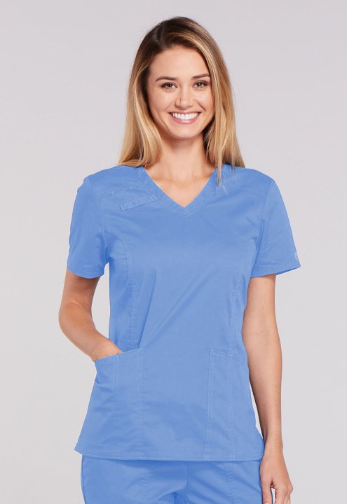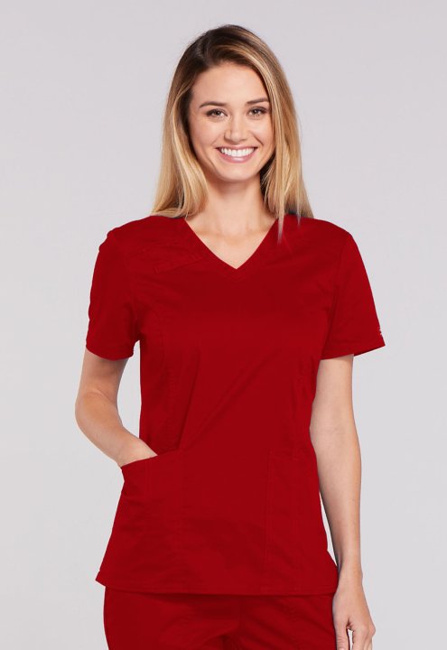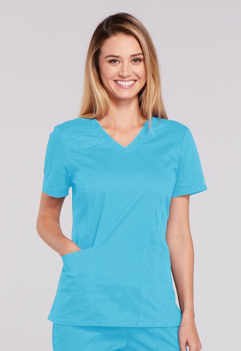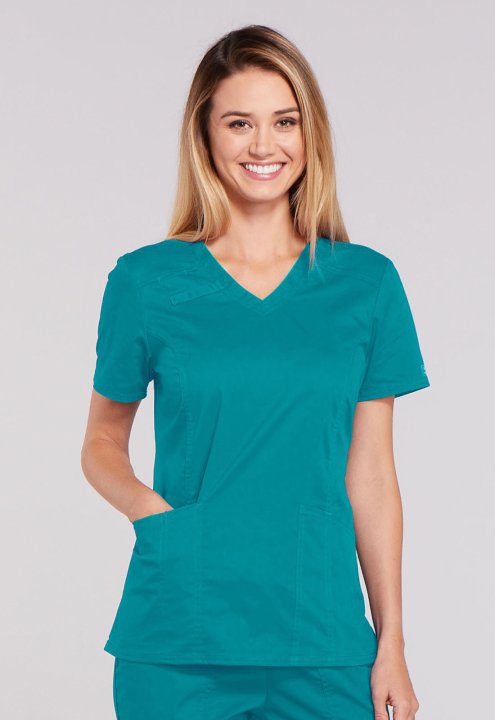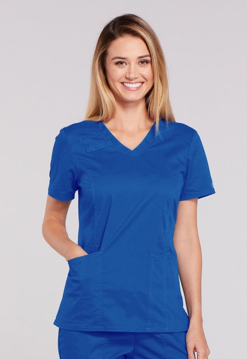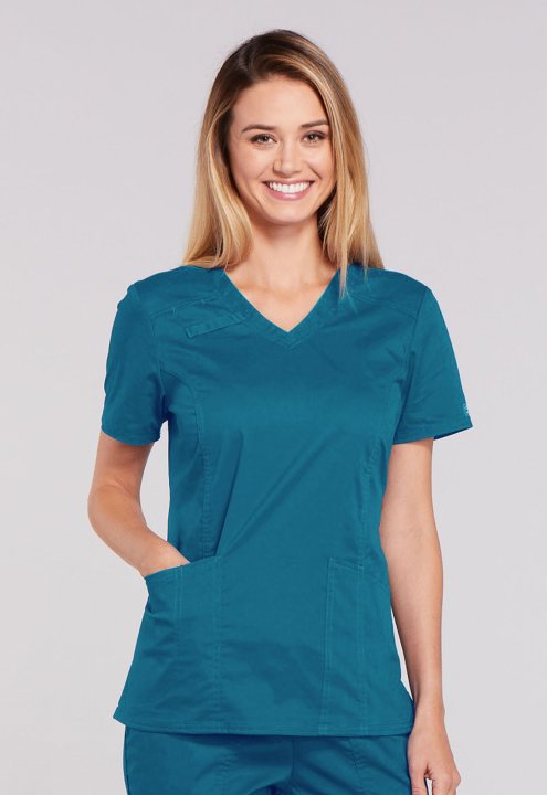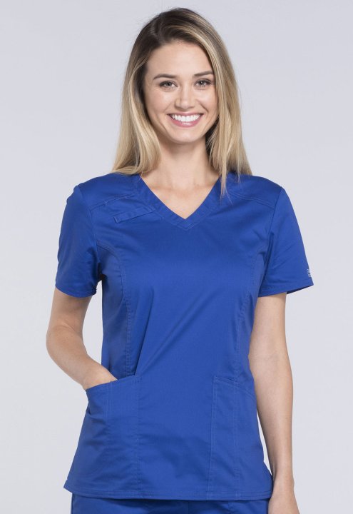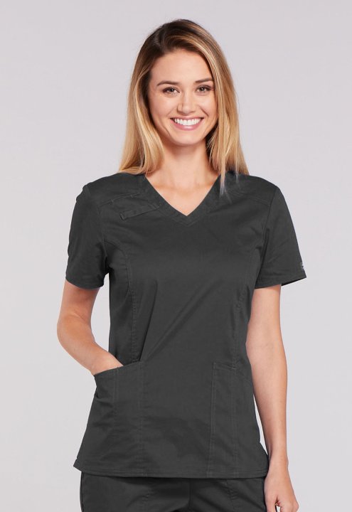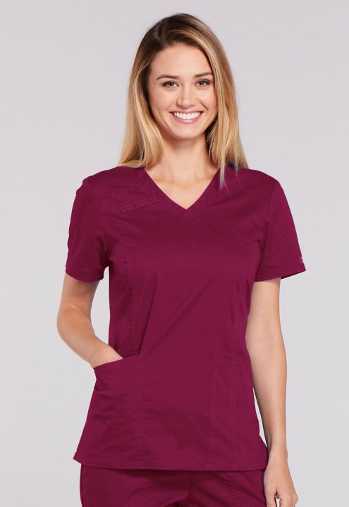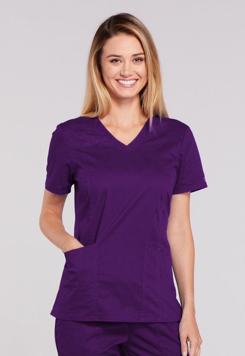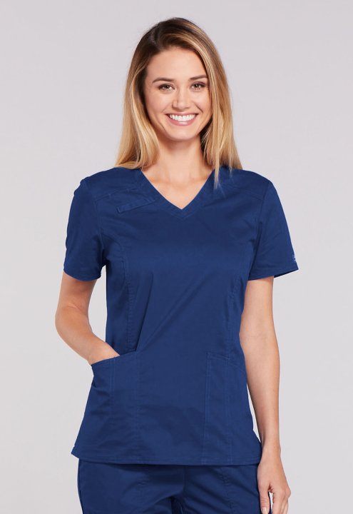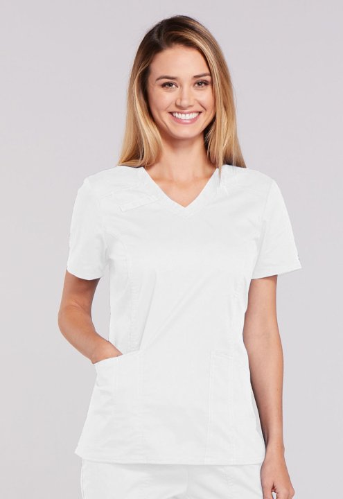 A Modern Classic fit V-neck top features front shoulder yokes with an I.D. badge slot, a stethoscope loop, patch pockets, an interior pocket, a pen slot and a back pocket. Also featured are front and back princess seams, side vents and double needle topst