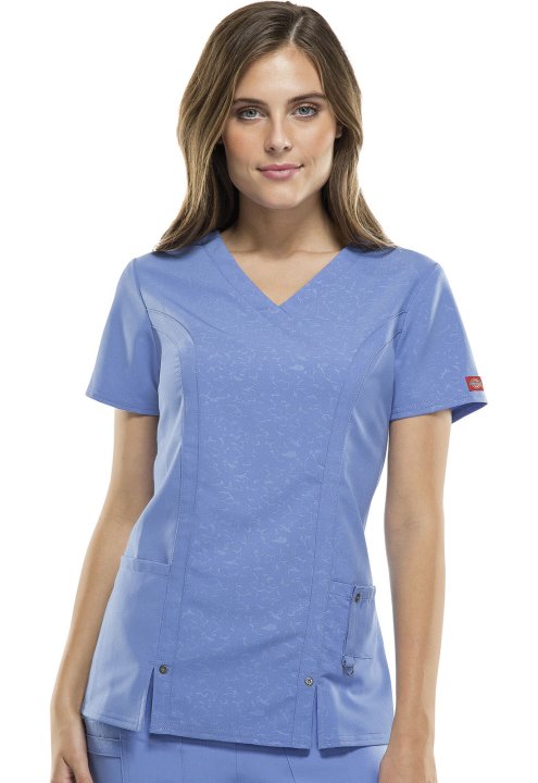 A Contemporary fit V-neck top features decorative logo eyelets at front princess strapping just above the vents, front patch pockets and a cell phone pocket that includes a self tab with a utility D-ring completed by a logo eyelet. Back princess seams add