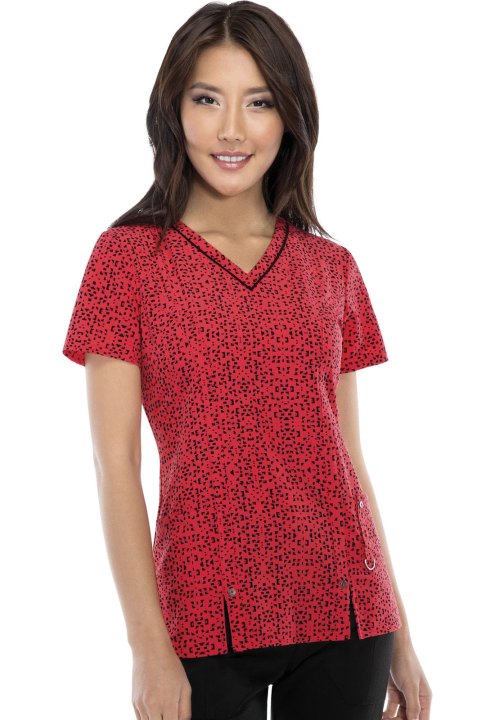 A Contemporary fit V-neck top features decorative logo eyelets at front princess strapping just above the vents, front patch pockets, and a cell phone pocket includes a self tab with a utility D-ring completed by a logo eyelet. Back princess seams for add