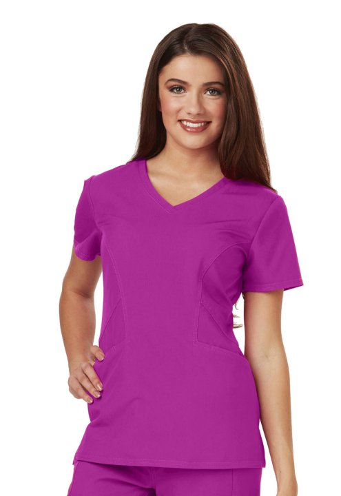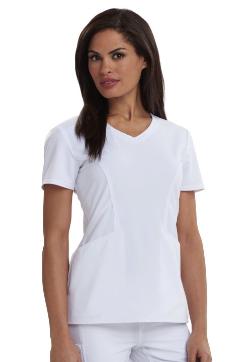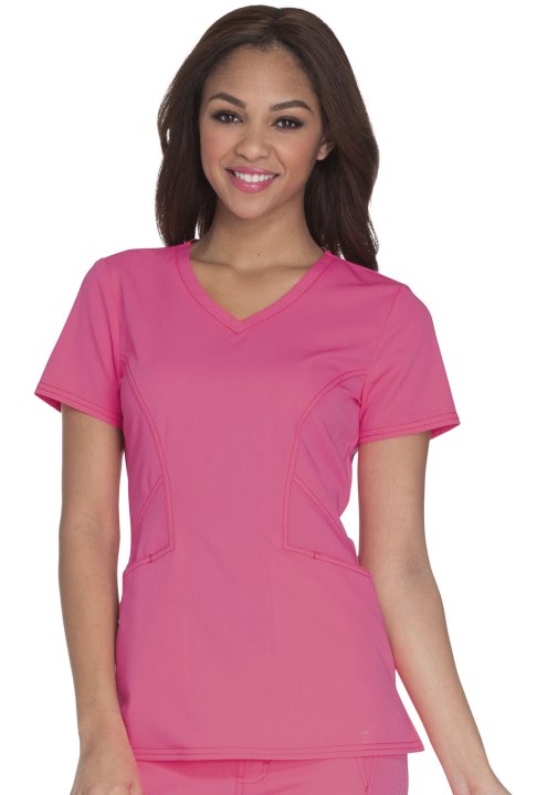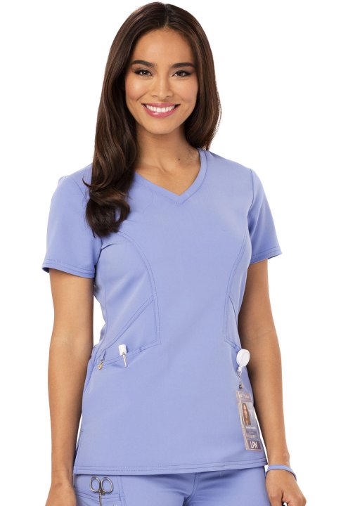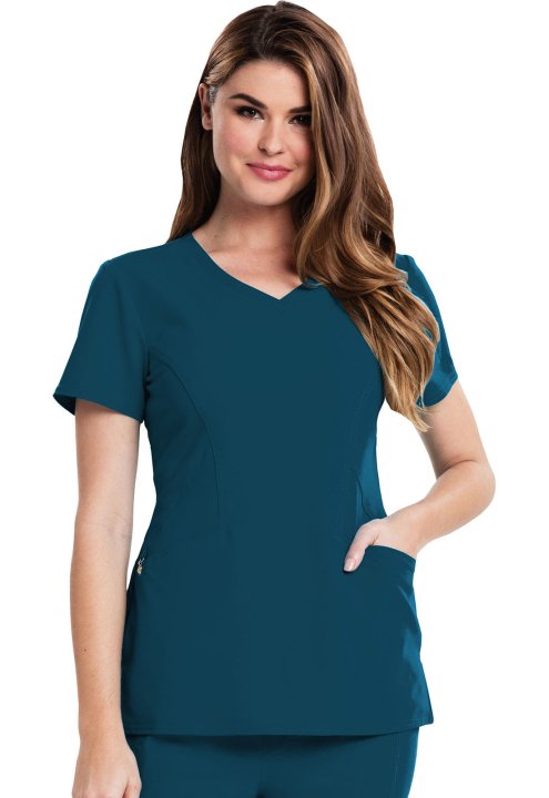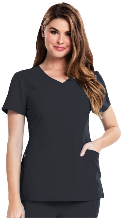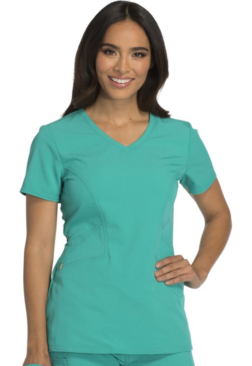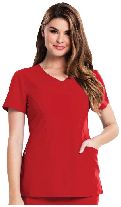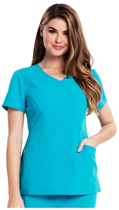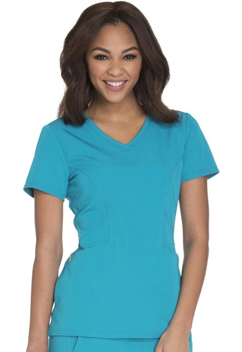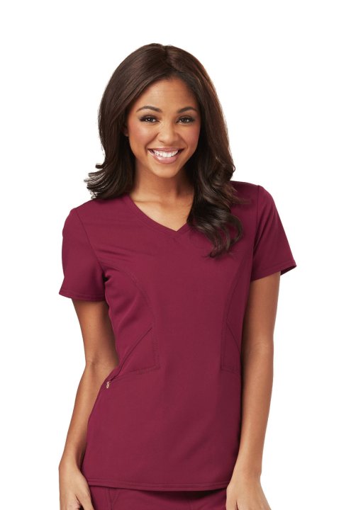 A Contemporary fit V-neck top features angled pockets with a removable wristlet inside the right pocket, signature gold foil branding, an exterior signature logo charm and signature woven tape at the back neck. Also featured is double needle topstitching,
