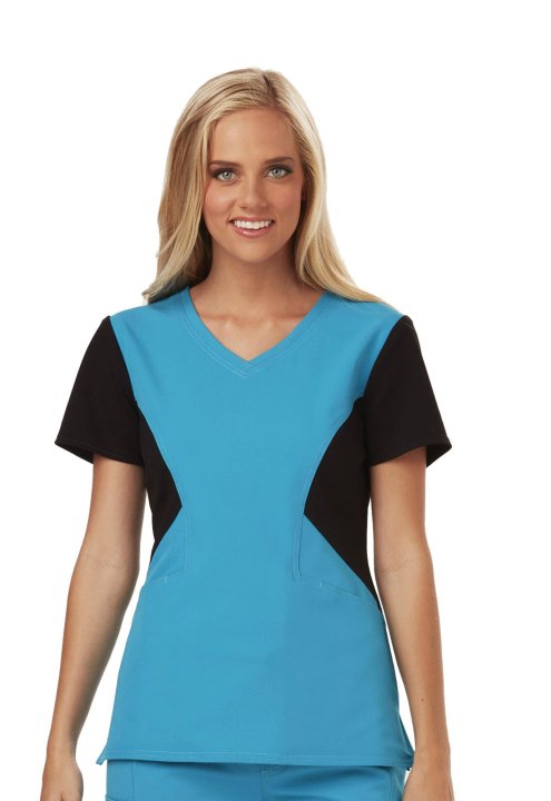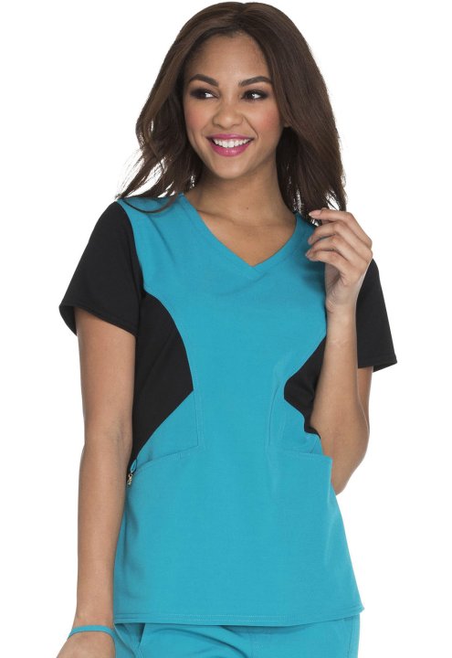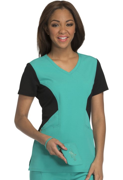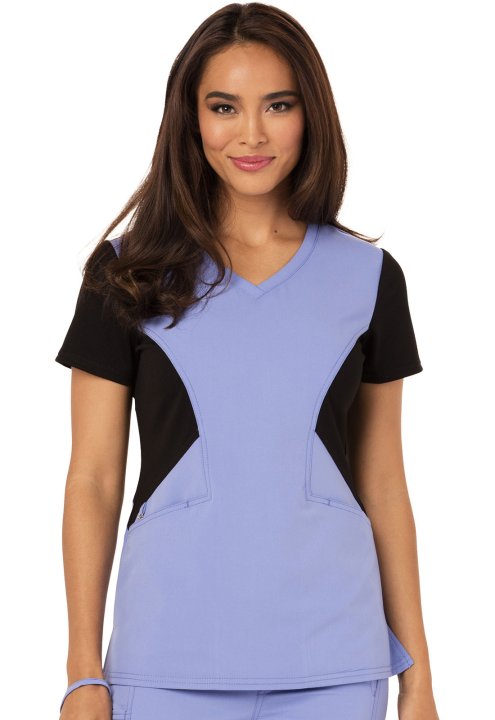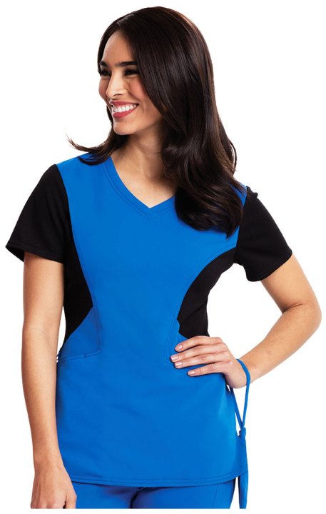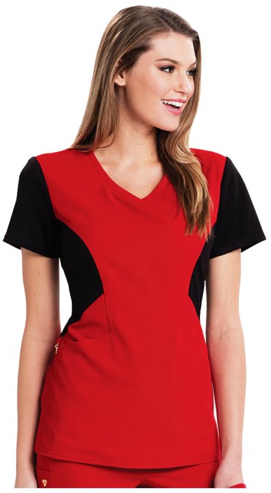 A Contemporary fit V-neck top features angled pockets with a removable wristlet inside the right pocket, gold foil branding, an exterior signature logo charm and signature woven tape at the back neck. Also featured is a contrast ponte knit at the side con