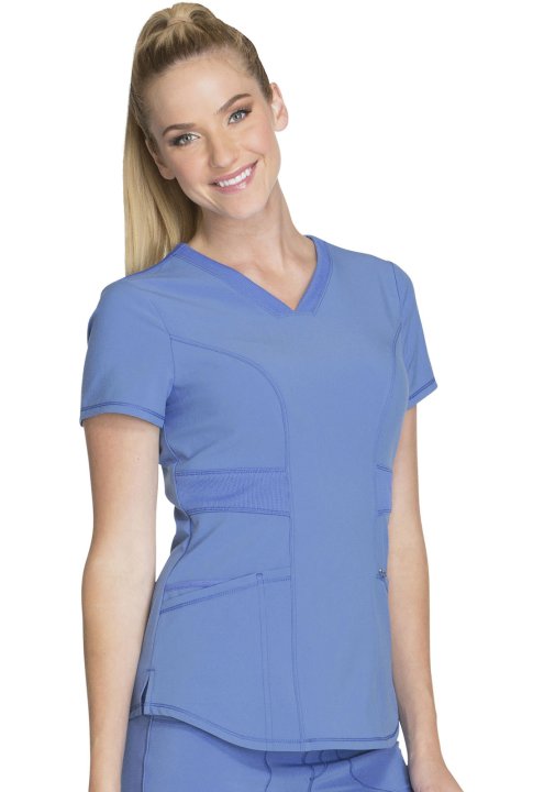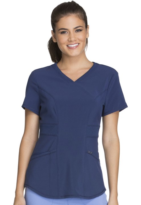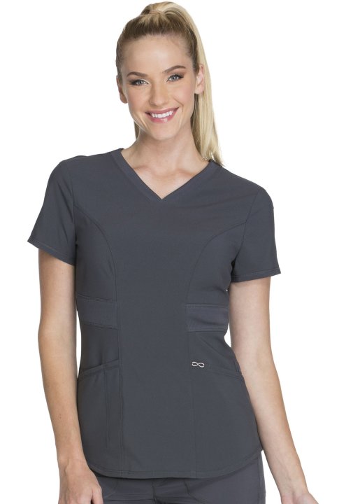 A Contemporary fit V-neck top features a rib waist inset and stretch rib knit panel at the center back for a slenderizing effect, as well as for extra movement and comfort. Also featured are two patch pockets, an interior pocket, pencil stitch, bungee I.D