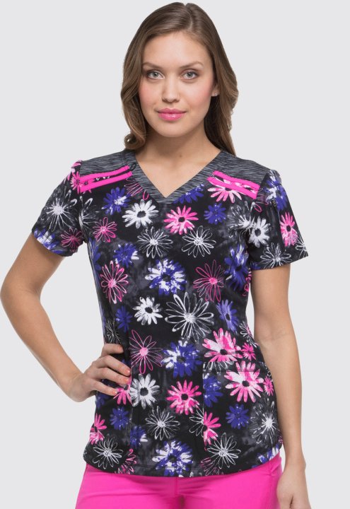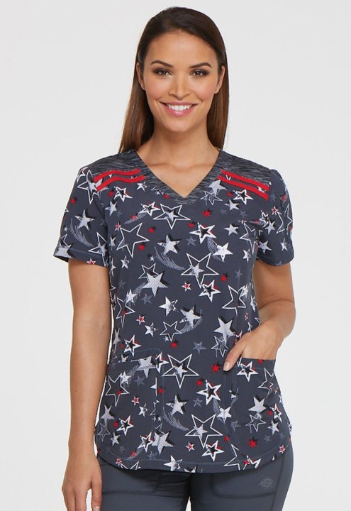 A Contemporary fit V-neck top features a space-dye knit at the neck and front and back yokes, three pockets; two front patch pockets, and a zipper sleeve pockets. Also features a tonal logo heat transfer, shirttail hem and side vents. Center back length: