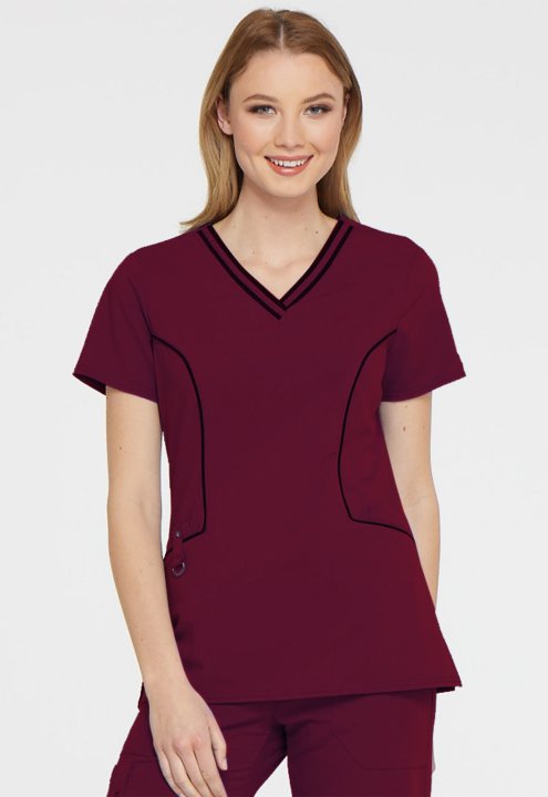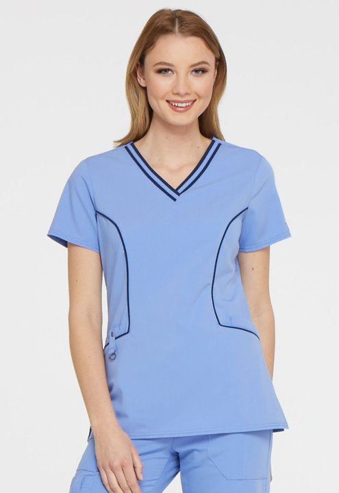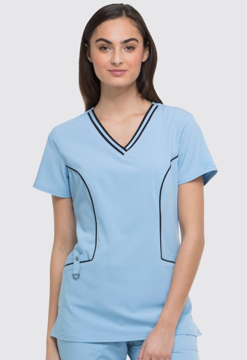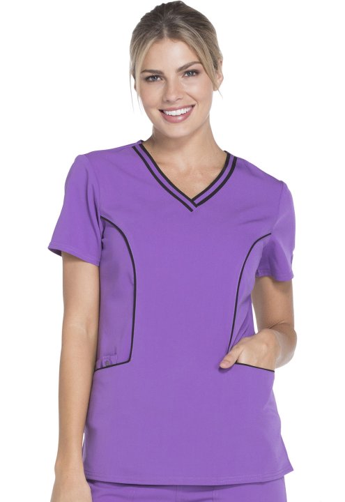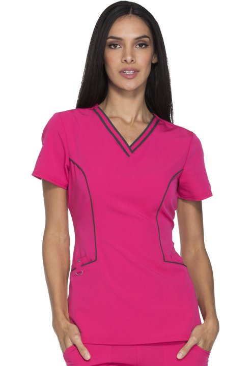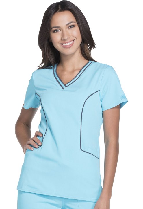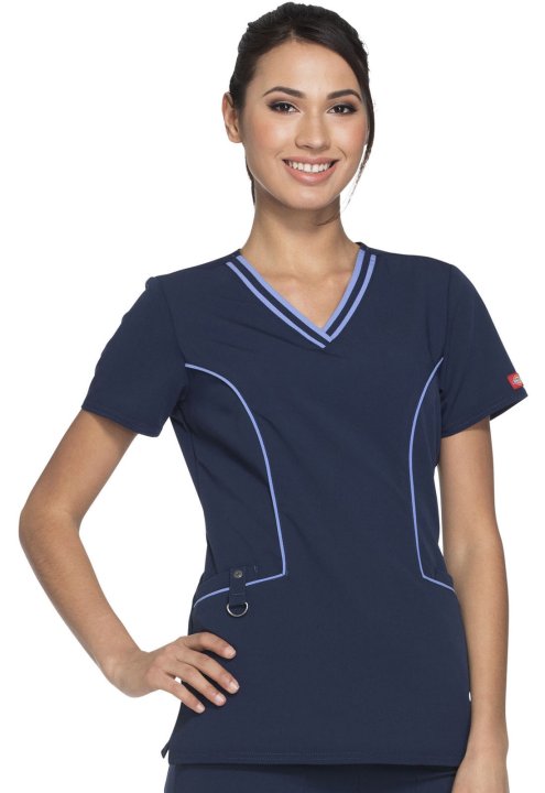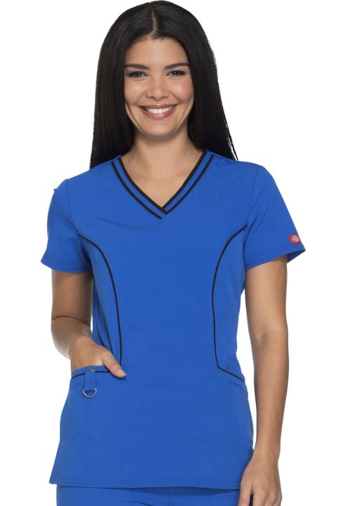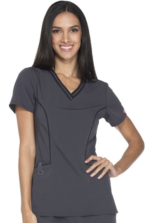 A Contemporary fit V-neck top features contrast banding around the neck, and four pockets, one with a self tab and utility D-ring, completed by a logo eyelet. Also featured are Dickies logo twill tape along the back neck, and front and back princess seams