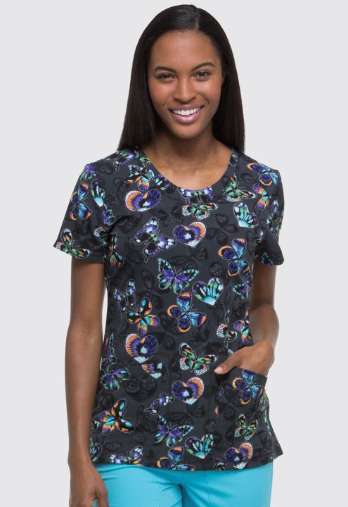 A Contemporary fit V-neck top features front and back yokes, bust darts, rounded front patch pockets (the right with an inside tonal cable-routing outlet), a tonal logo heat transfer at the sleeve and coverstitch detail throughout. Center back length: 26"