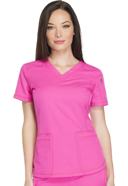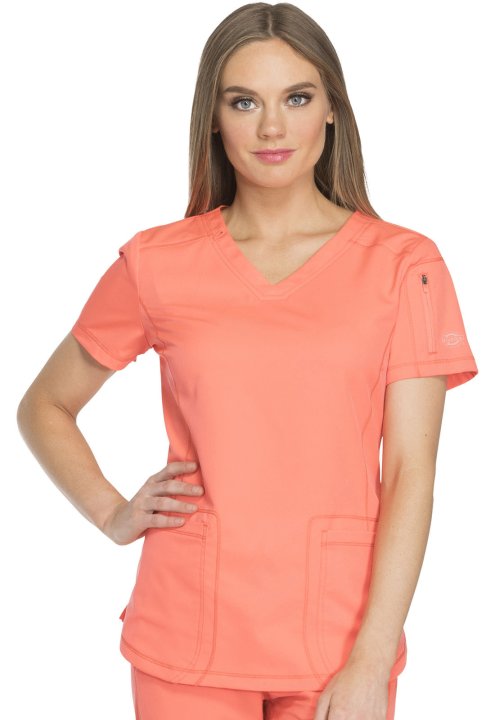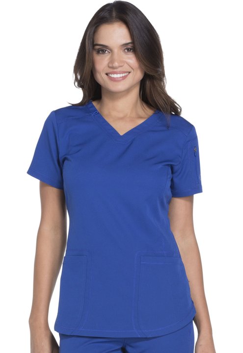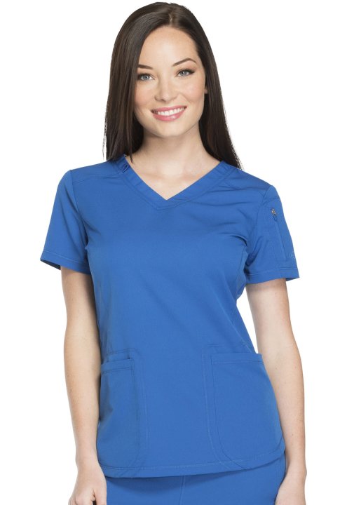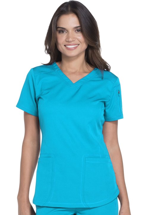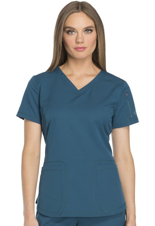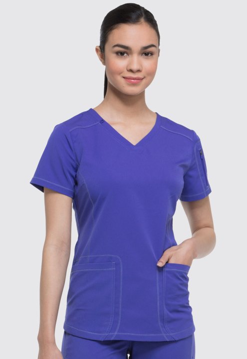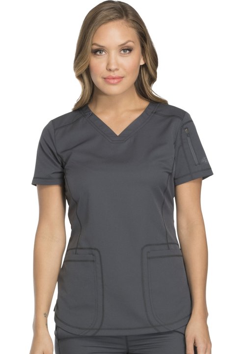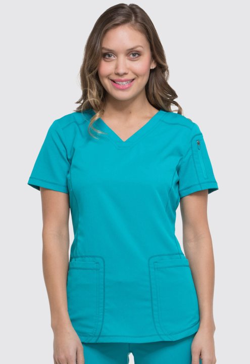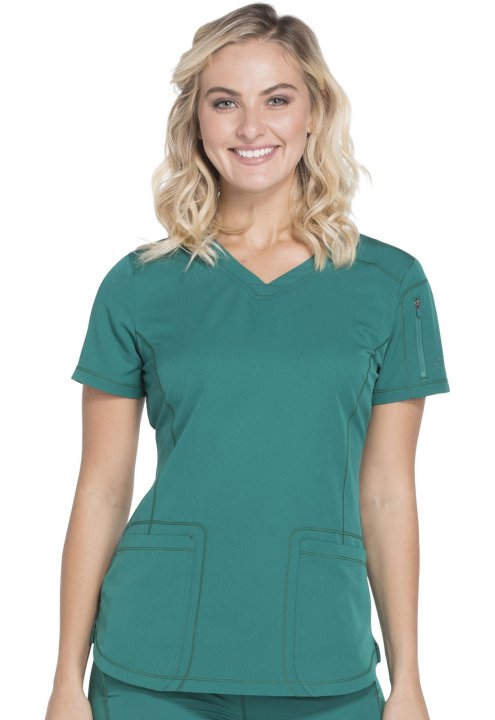 A Contemporary fit V-neck top features front and back yokes, front princess seam detail and rounded front patch pockets (the right with an inside tonal cable-routing outlet). Also featured are a zip-closure sleeve pocket with tonal logo heat transfer, sid