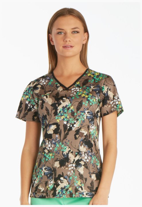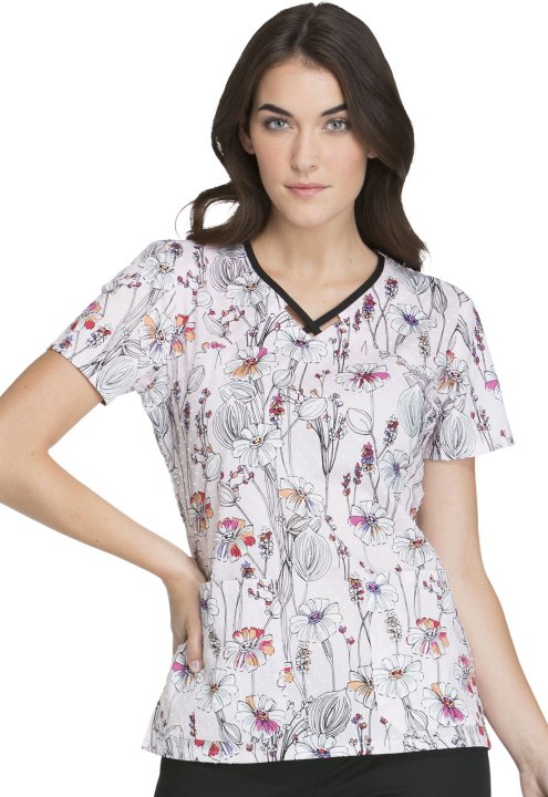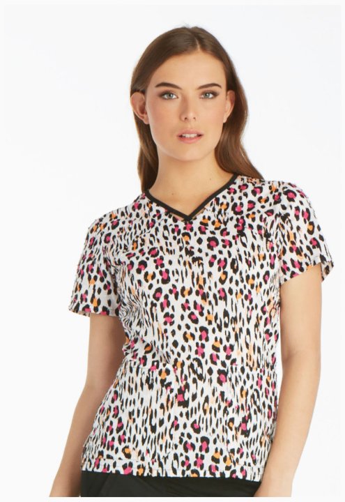 A Modern Classic fit V-neck top features a cut-out detail at the front neckline, patch pockets, back darts and side vents. Center back length:26