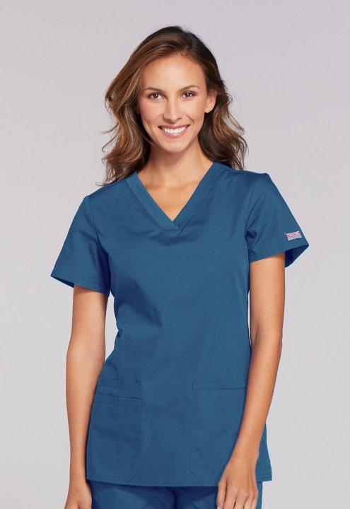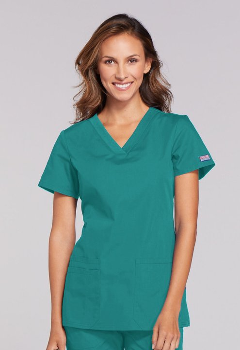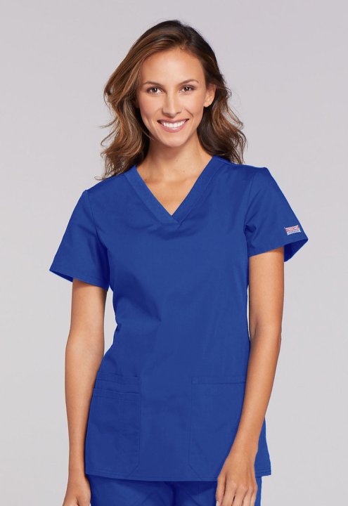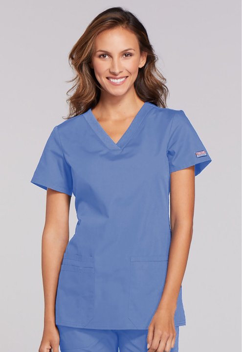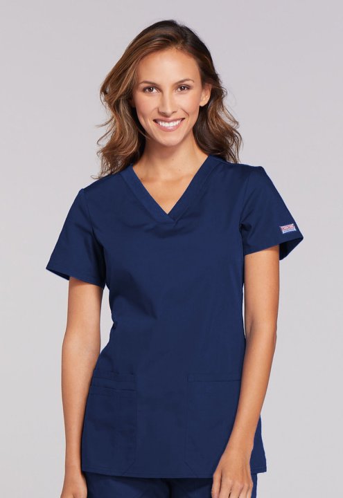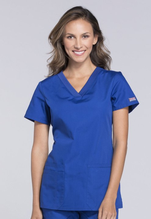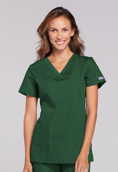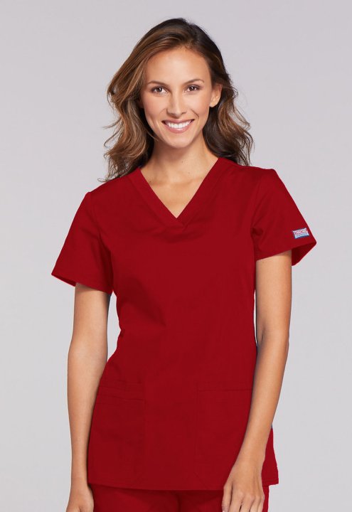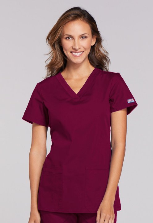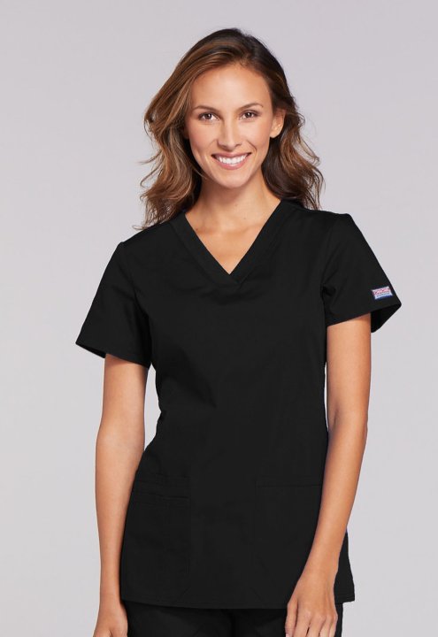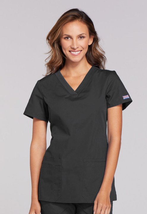 A Contemporary fit V-neck top features front patch pockets (the right with an exterior pocket and pen slot, the left with a hidden instrument loop), side vents and stretch rib knit at the back side panels for movement and extra comfort. Center back length