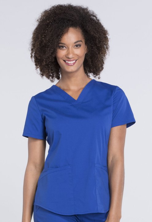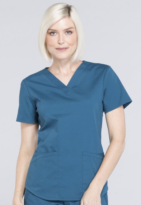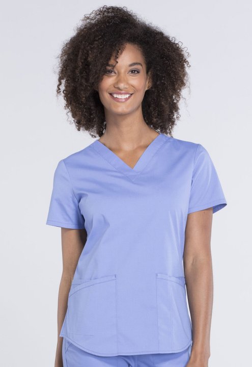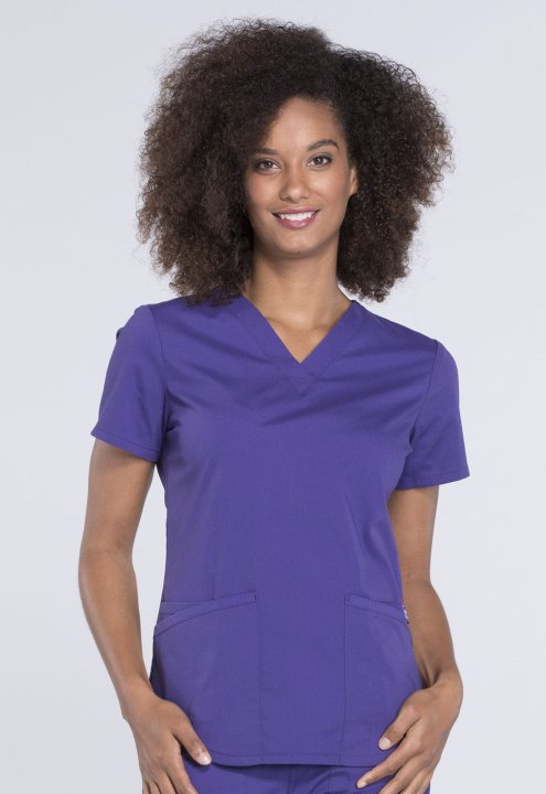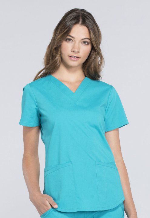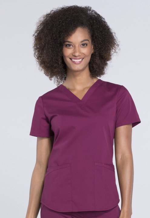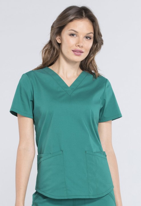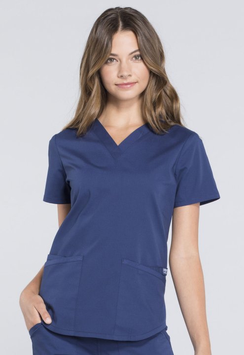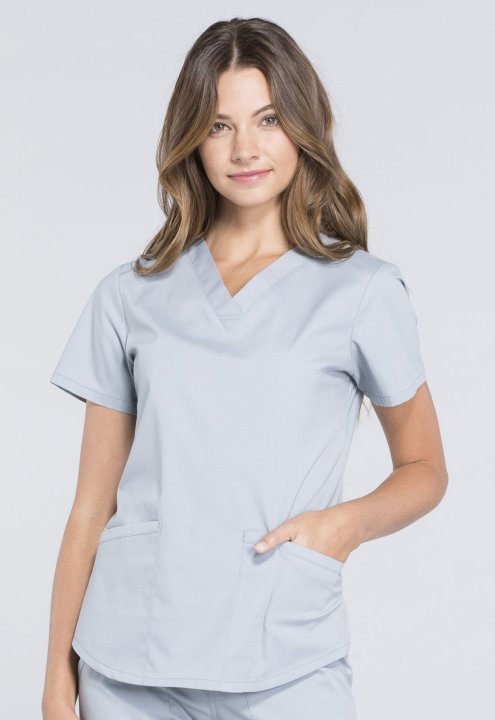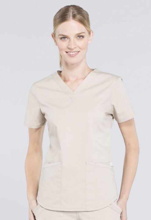 A Modern Classic fit V-neck top features two patch pockets, a cellphone pocket, instrument loop, pencil stitch, back yoke, shirttail hem and side vents. Center back length: 26