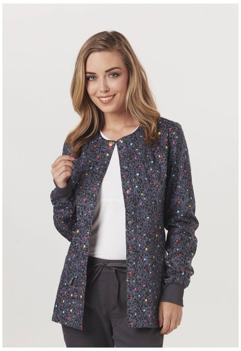 A Contemporary fit warm-up jacket features a front-snap closure with one logo snap, front and back princess seams, patch pockets, a bungee I.D. loop and signature mesh binding at the back neck. Also featured are rib knit cuffs and double-needle topstitchi