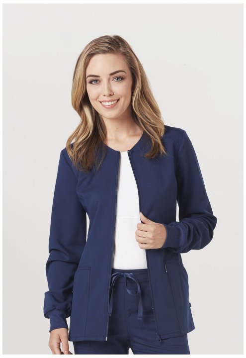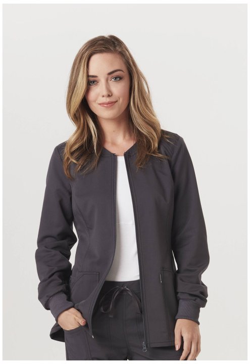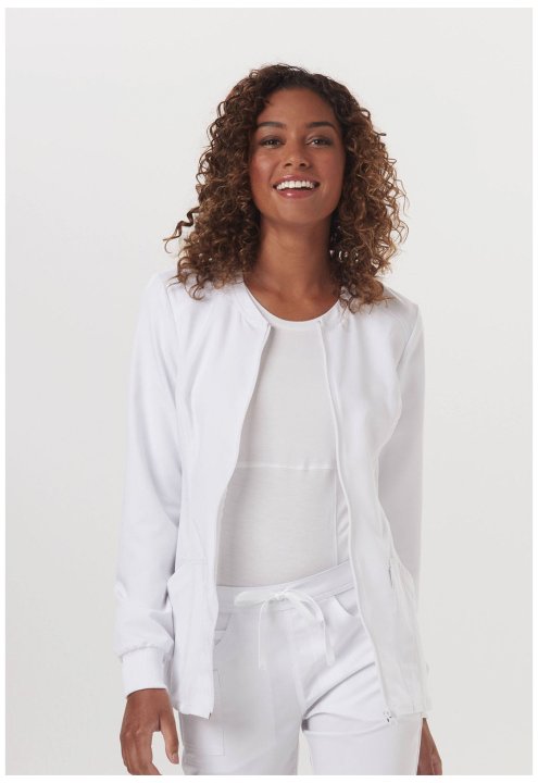 A Contemporary fit, zip front warm-up jacket features multifunction pockets that hold all your gear, along with an inside snap-closure pocket that reveals the message, smile, love, connect. Also featured is an instrument loop and rib knit cuffs. Center ba