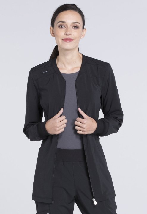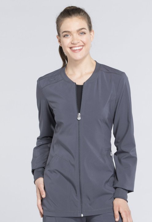 A sporty, Contemporary fit, zip front warm-up jacket features shoulder yokes, a bungee I.D. badge loop on the right shoulder and two set-in front pocketsthe right with an interior pocket, the left with a logo O-ring. Also featured are front and back princ