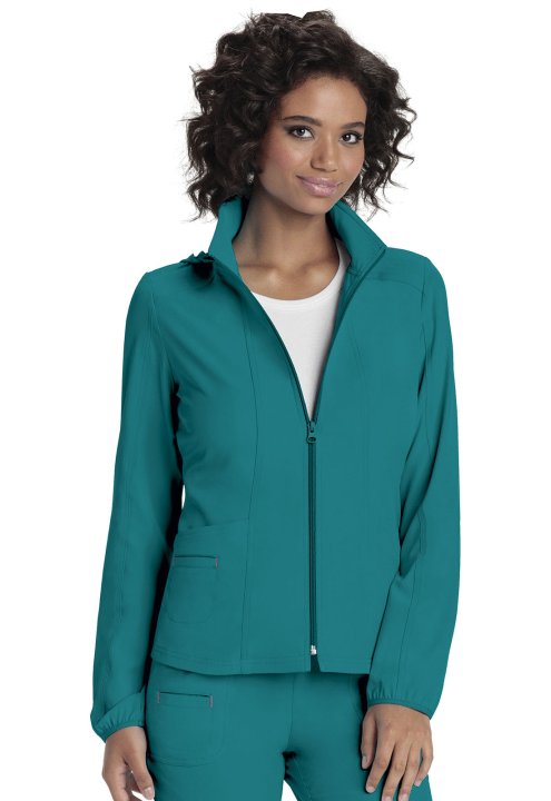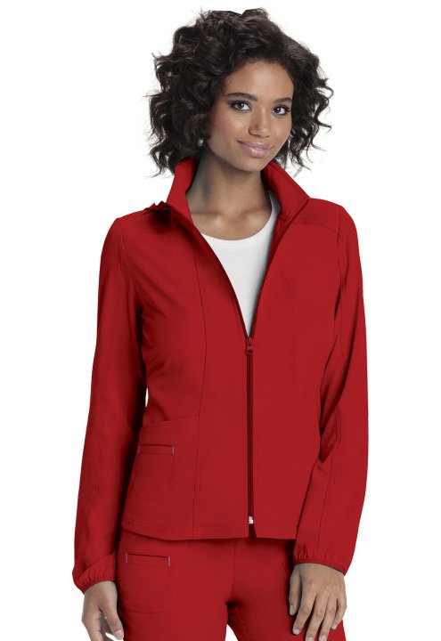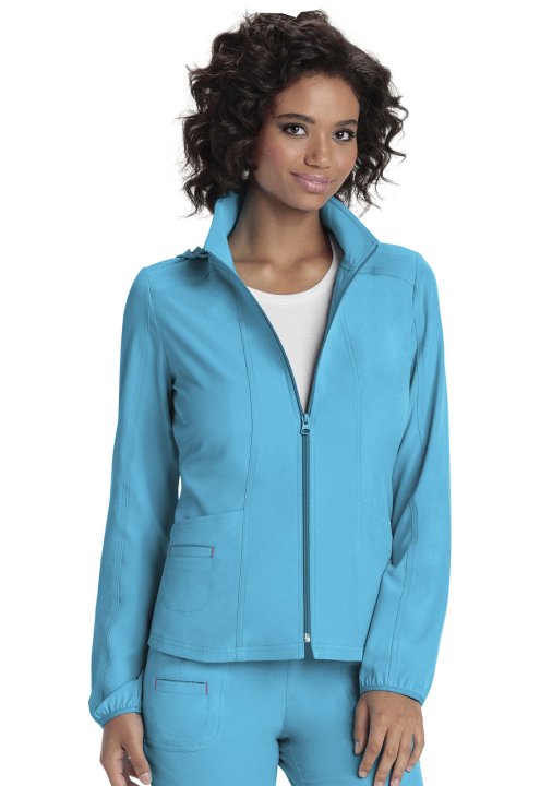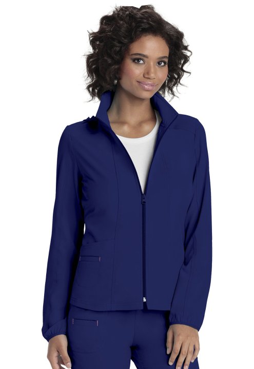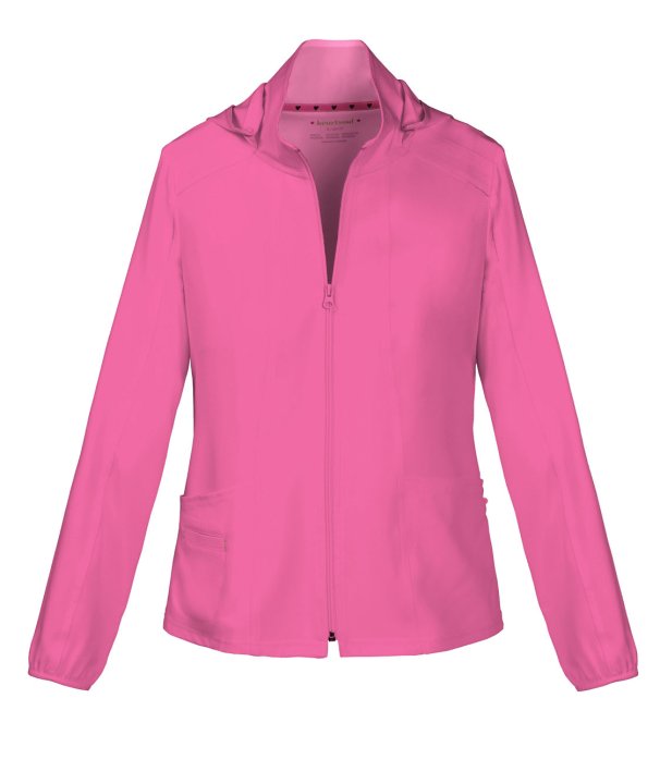 A Contemporary fit, zip front warm-up jacket has a detachable hood, front and back princess seams, patch pockets and an outer welt pocket with signature pink contrast bar tacks. Also featured are a hidden pink grommet and bungee loop for headphone cable m