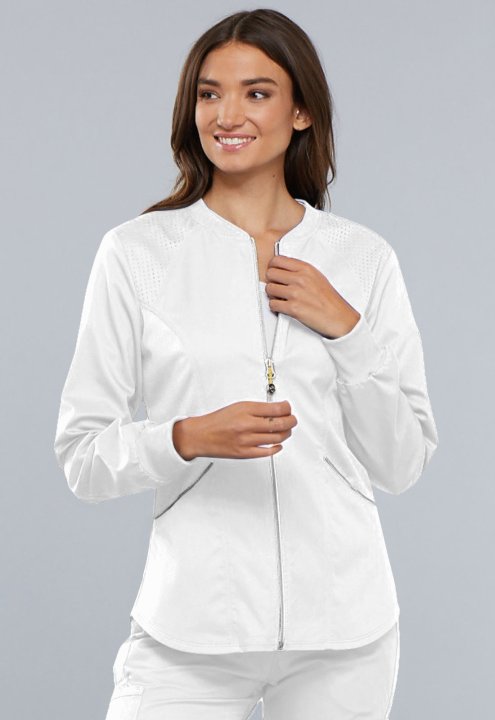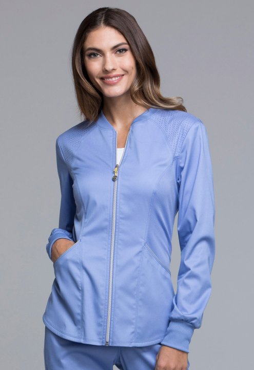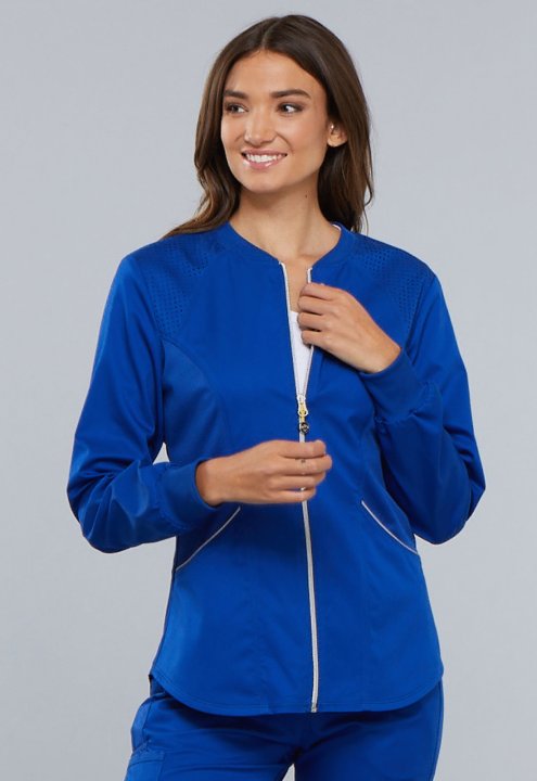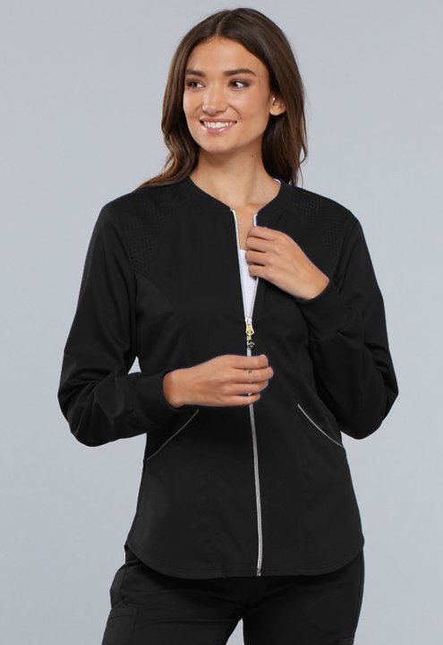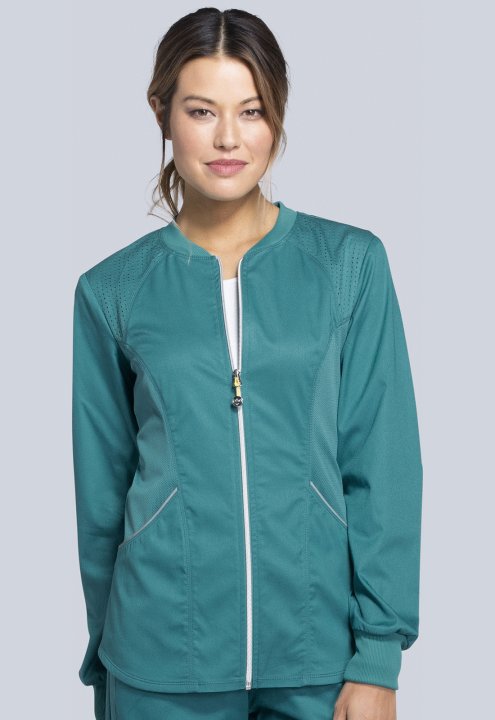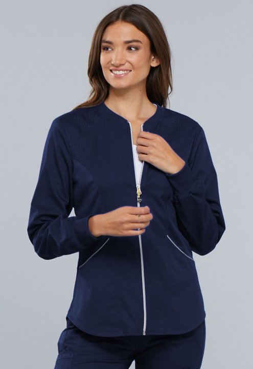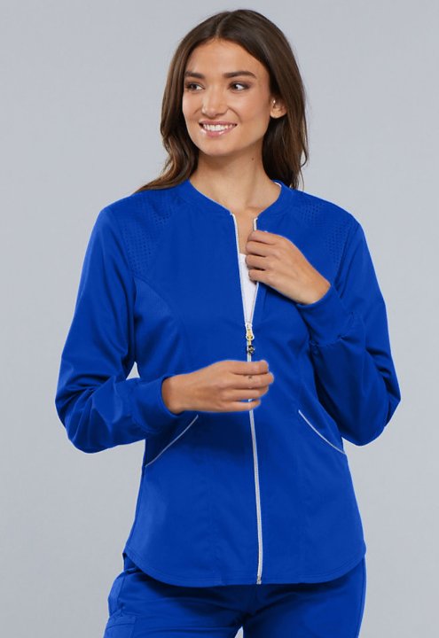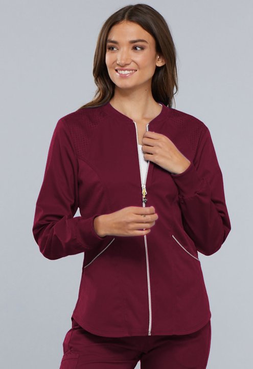 A Contemporary fit, zip front warm-up jacket features tonal stretch knit mesh side and back panels, and perforated, mesh-lined shoulder yokes for style and comfort. Also featured are front and back princess seams, set-in front pockets with reflective pipi