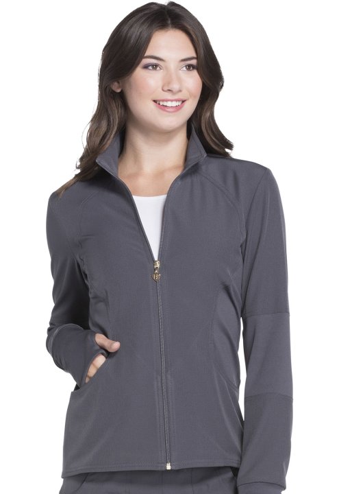 A Contemporary fit, zip front warm-up jacket has rib knit side panels, elbow panels and cuffs. Also featured are front pockets; front and back princess seams; and signature woven neck tape, triple-heart heat transfer and heart grommet detail. Center back