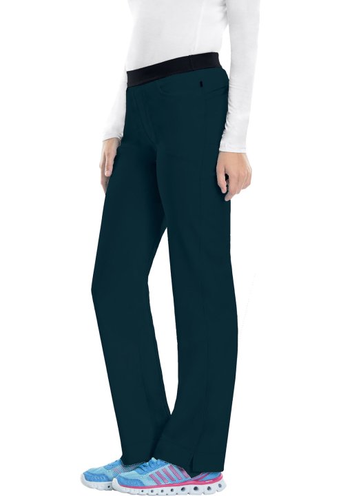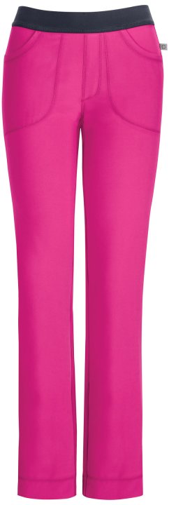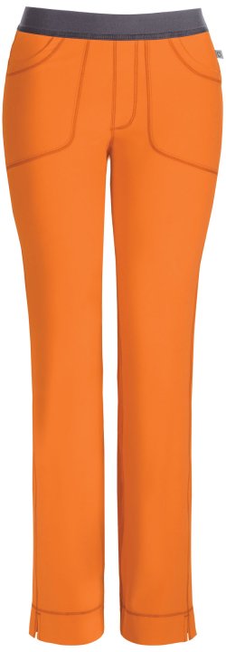 A Contemporary fit, low-rise, slim pant features a soft elastic waistband, front curved pockets and a mock fly. Also featured is a back yoke in stretch rib knit for added comfort, two back pockets and side vents. Cover-stitch detail throughout. Inseam len